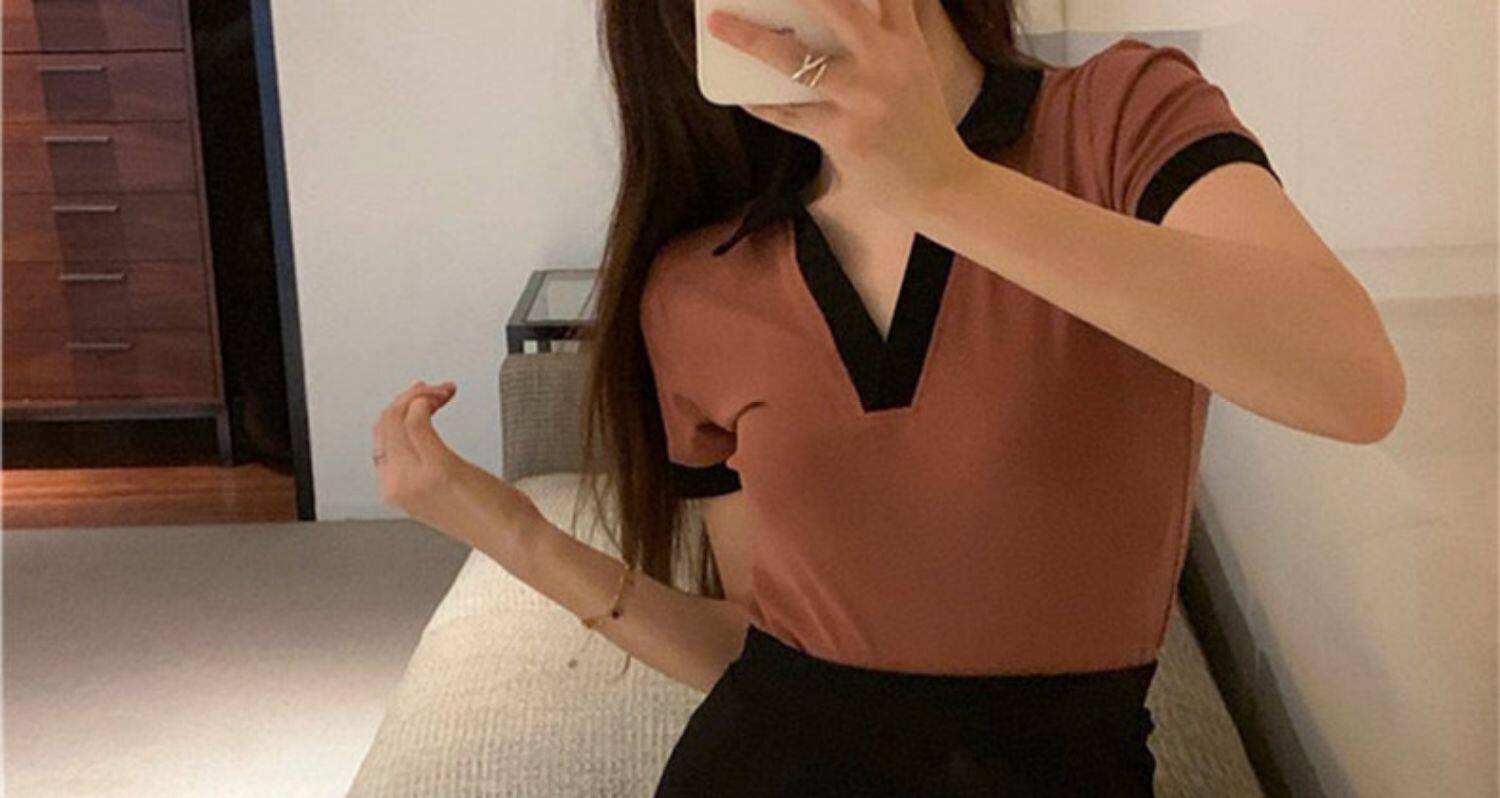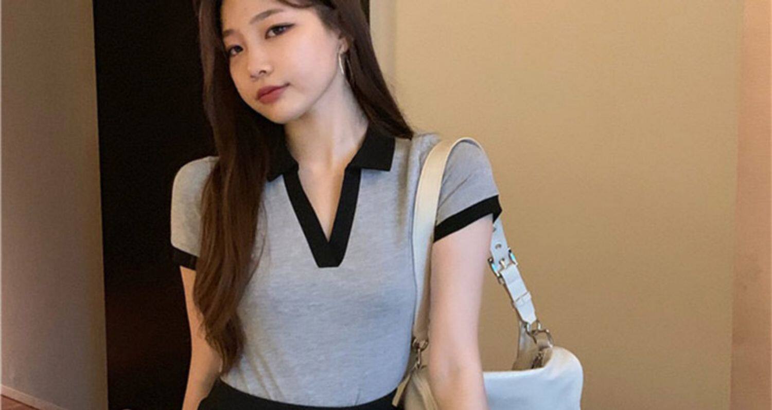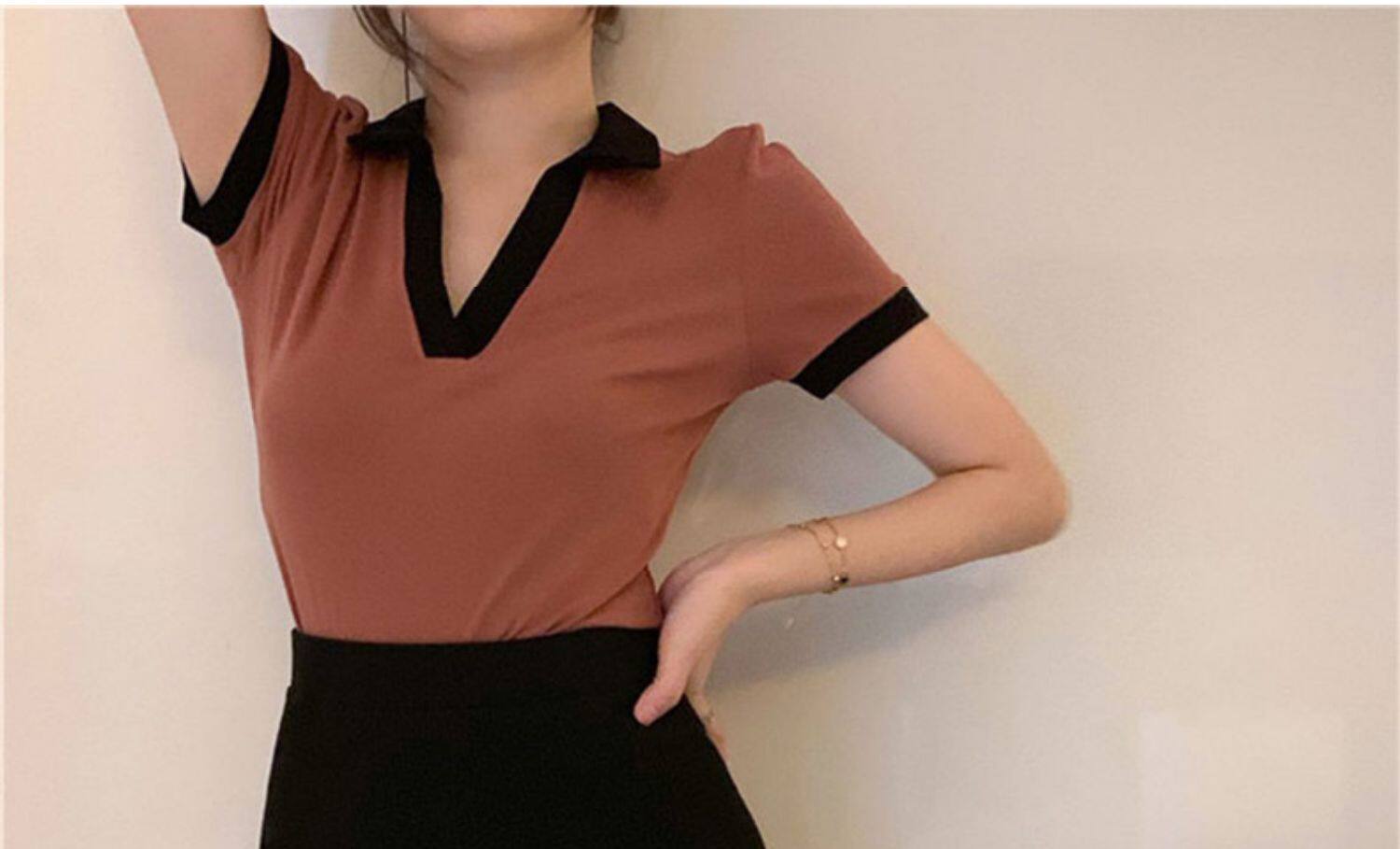 Приталенная осенняя короткая футболка с коротким рукавом, коллекция 2023, воротник поло