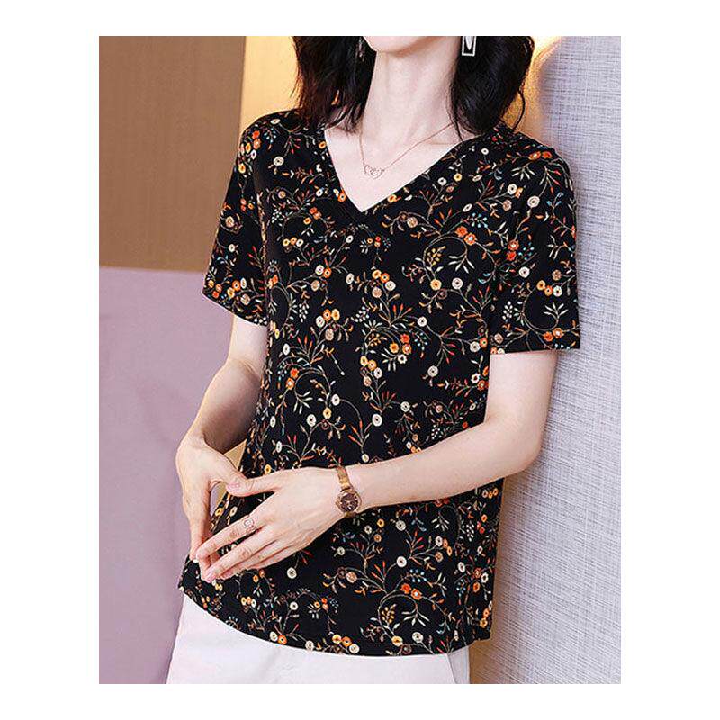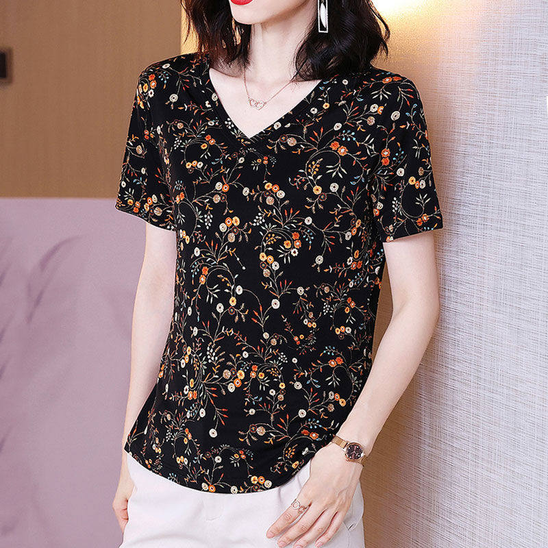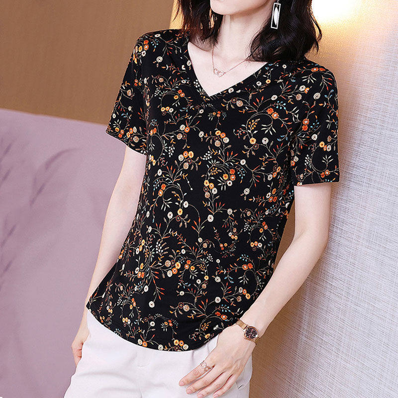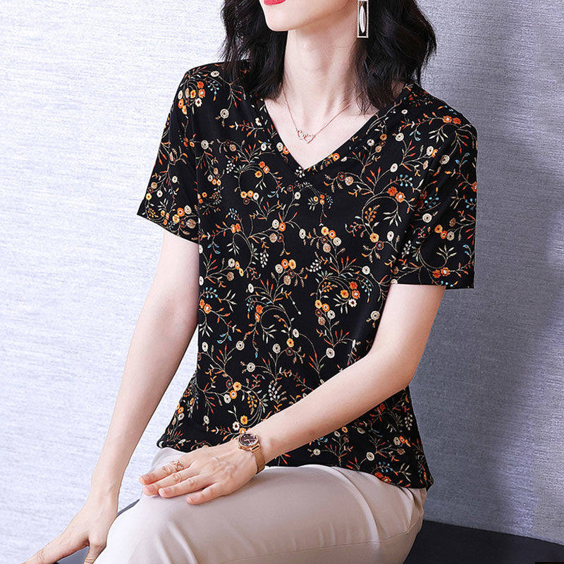 Летняя шелковая этническая футболка, V-образный вырез, этнический стиль, свободный крой