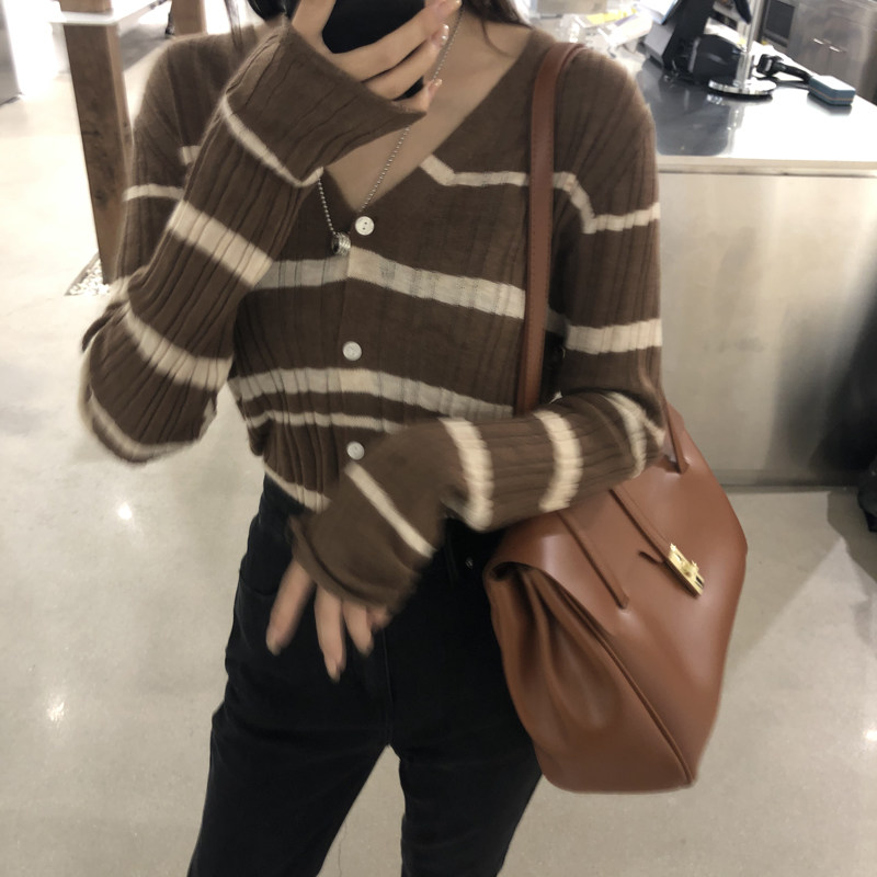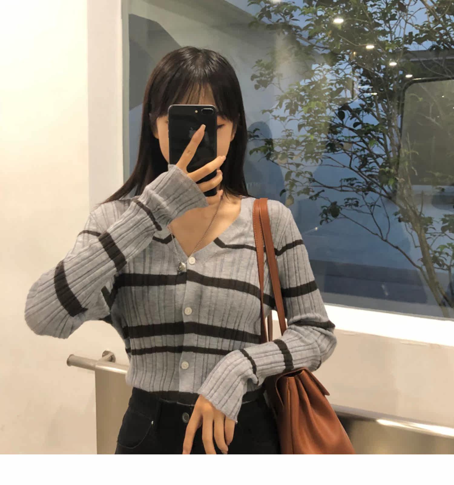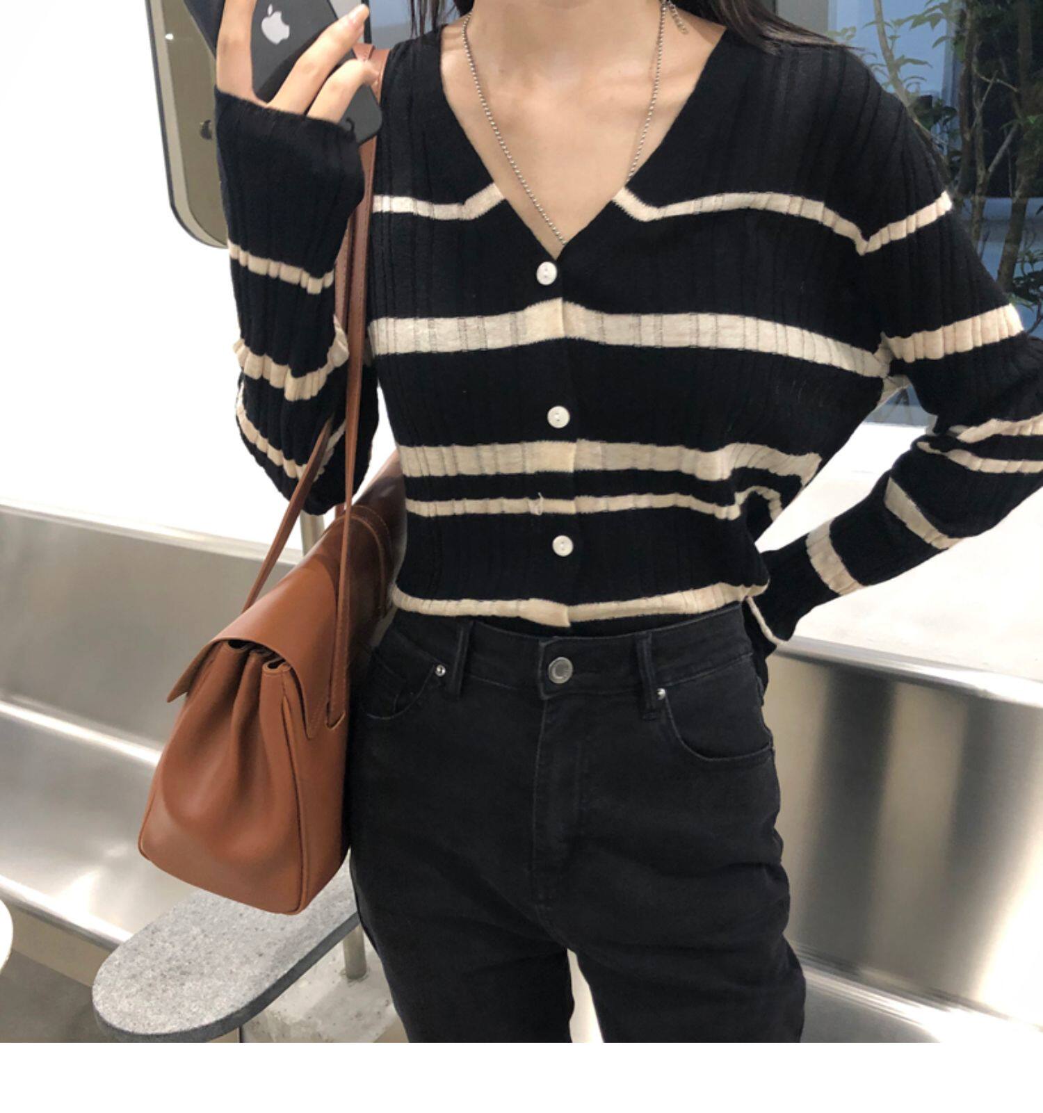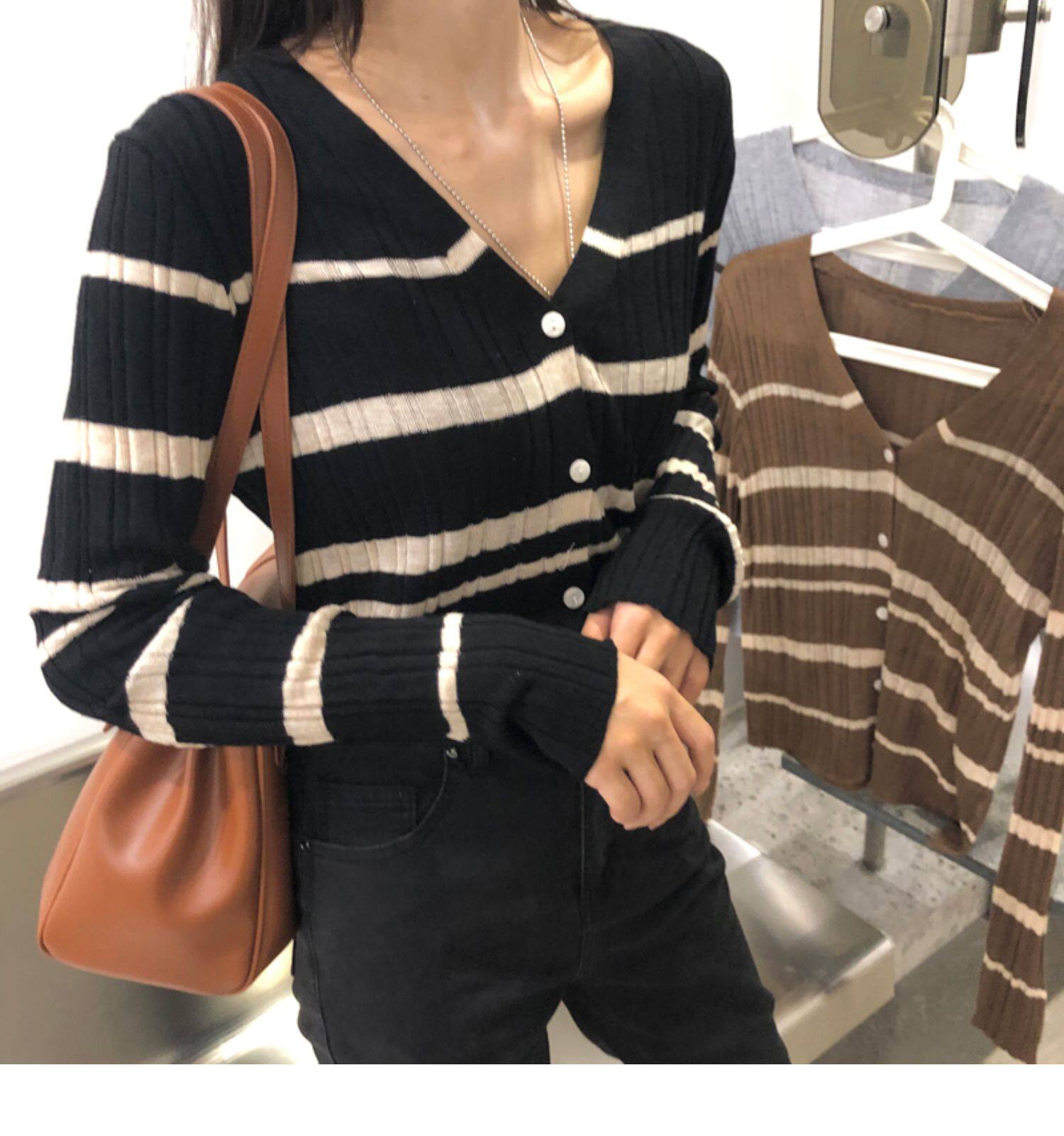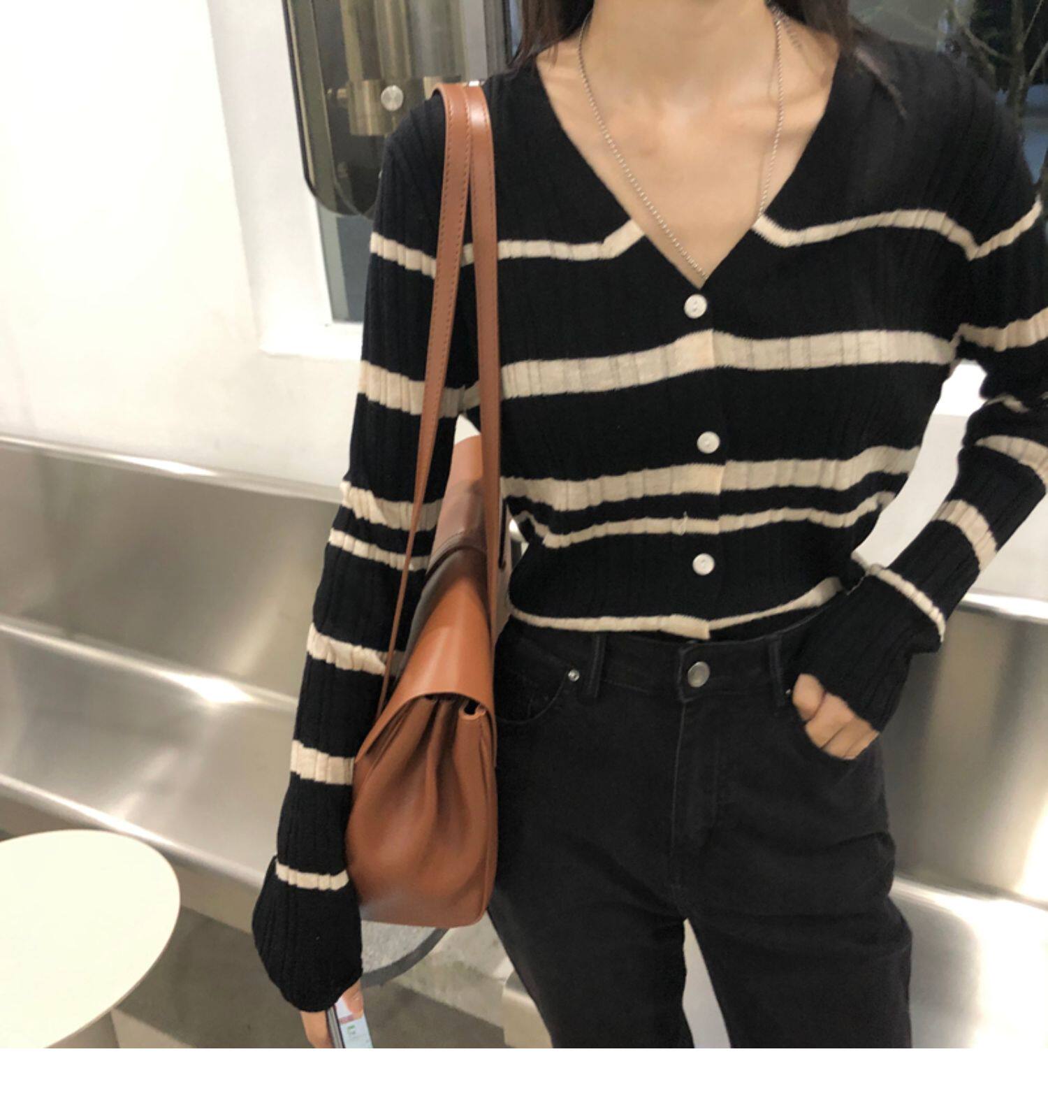 Осенняя ретро дизайнерская футболка, трикотажный приятный телу лонгслив, французский стиль, V-образный вырез, тренд сезона