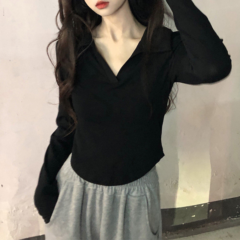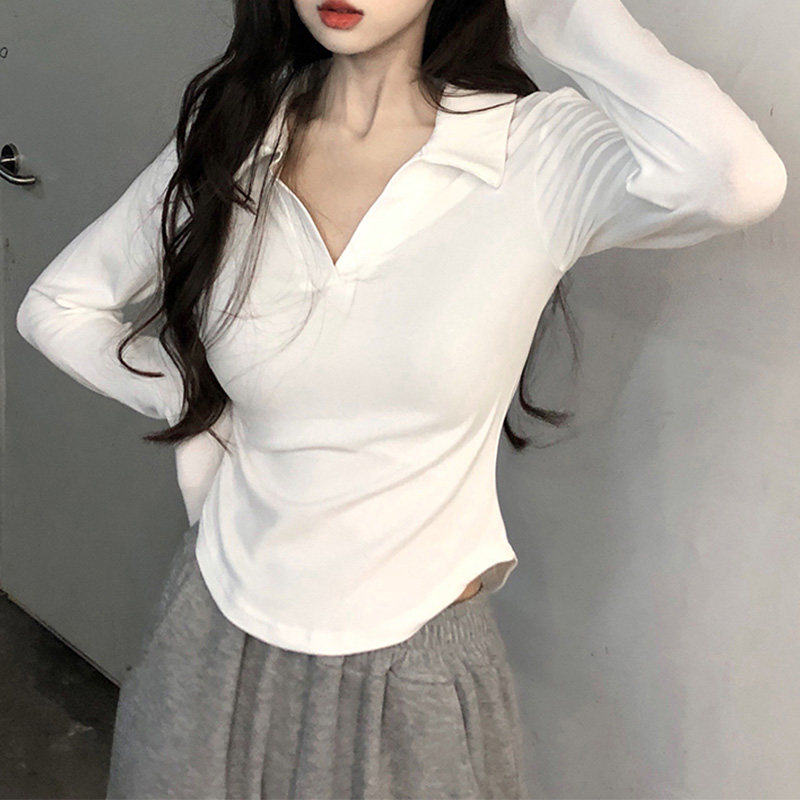 Белый небольшой лонгслив, футболка polo, осенний, французский стиль