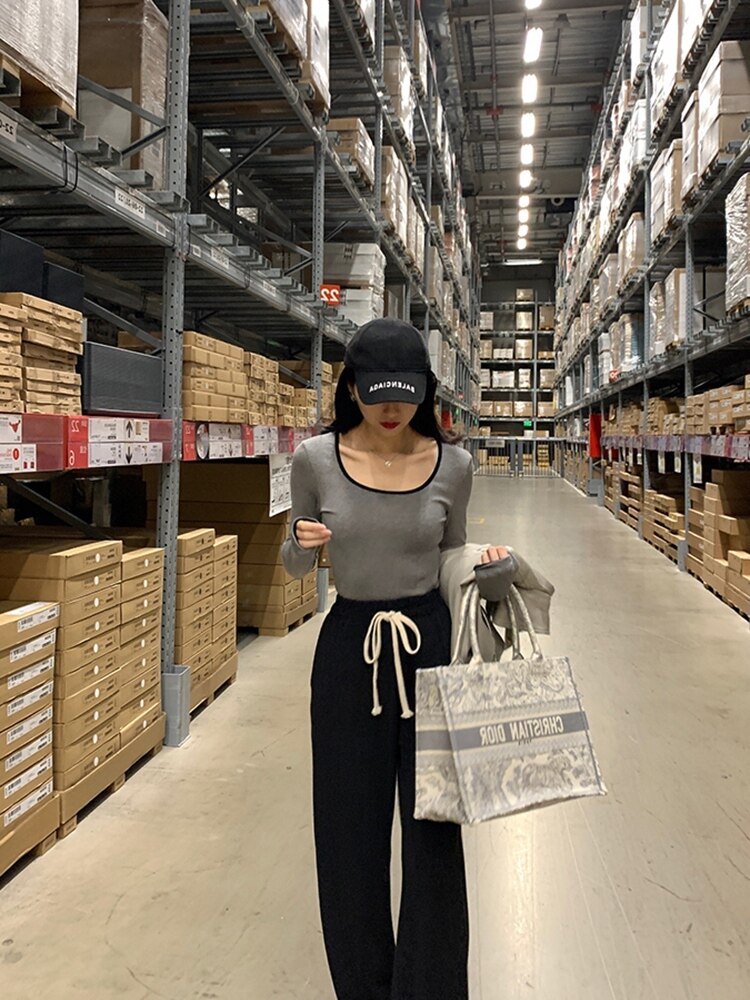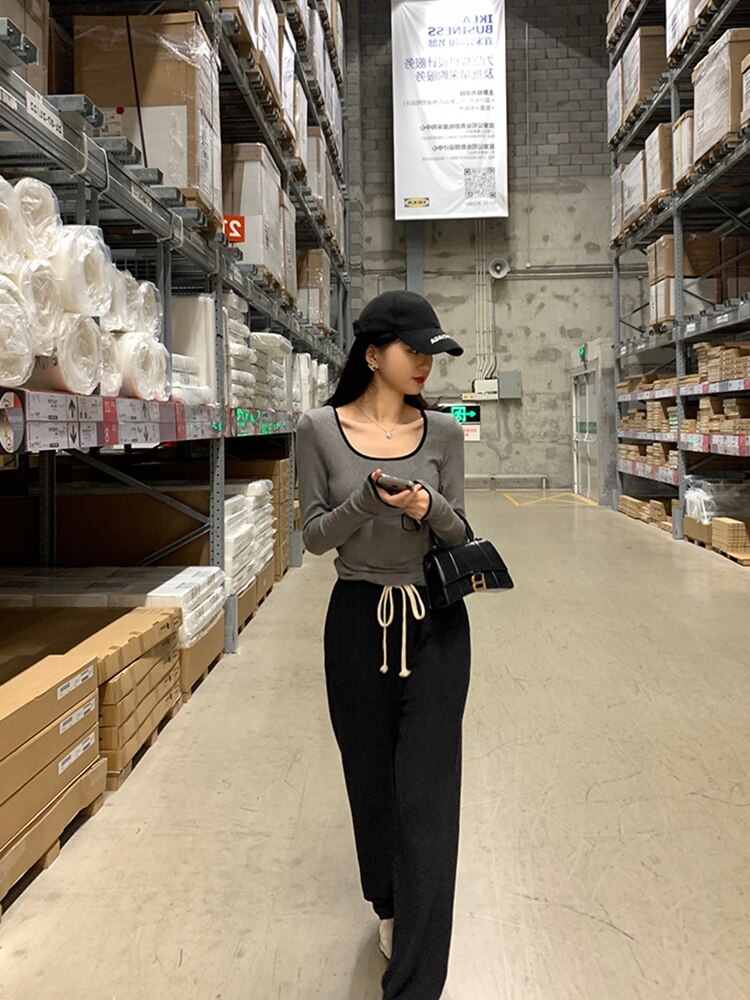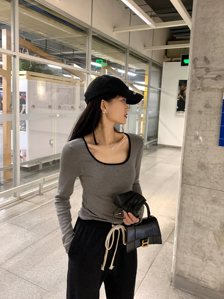 Базовый приятный телу модный осенний лонгслив, европейский стиль, квадратный вырез, по фигуре, 2023