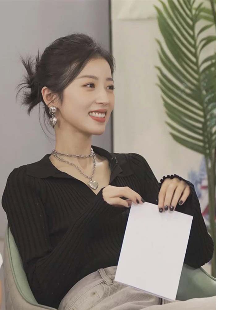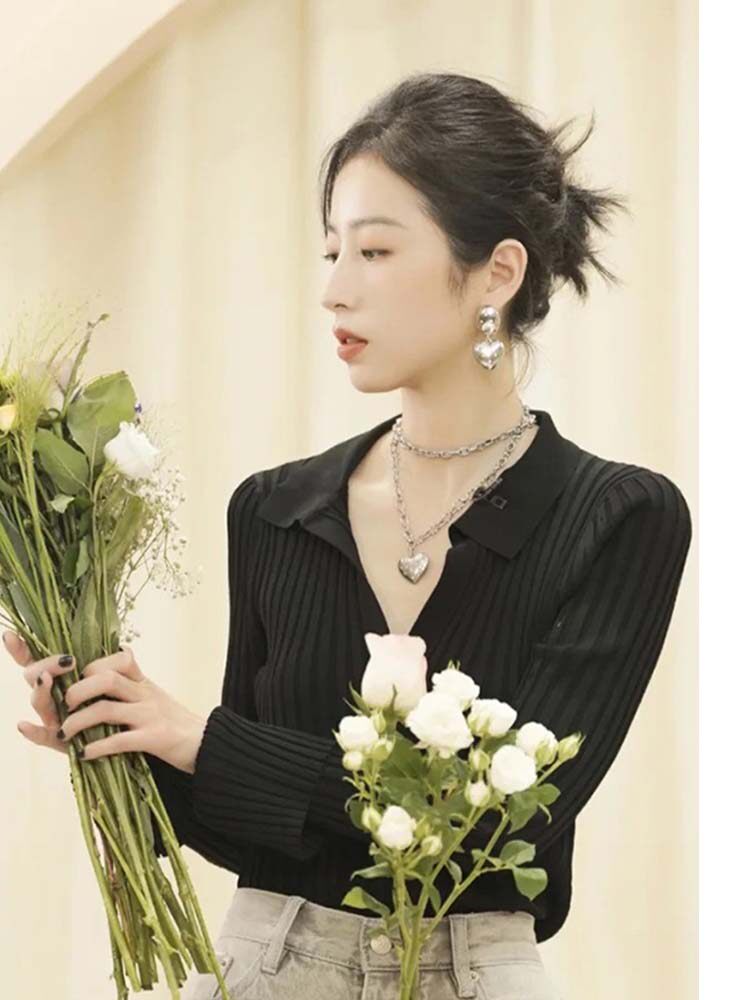Сексуальный черный лонгслив, трикотажный свитер, осенний, V-образный вырез, воротник поло