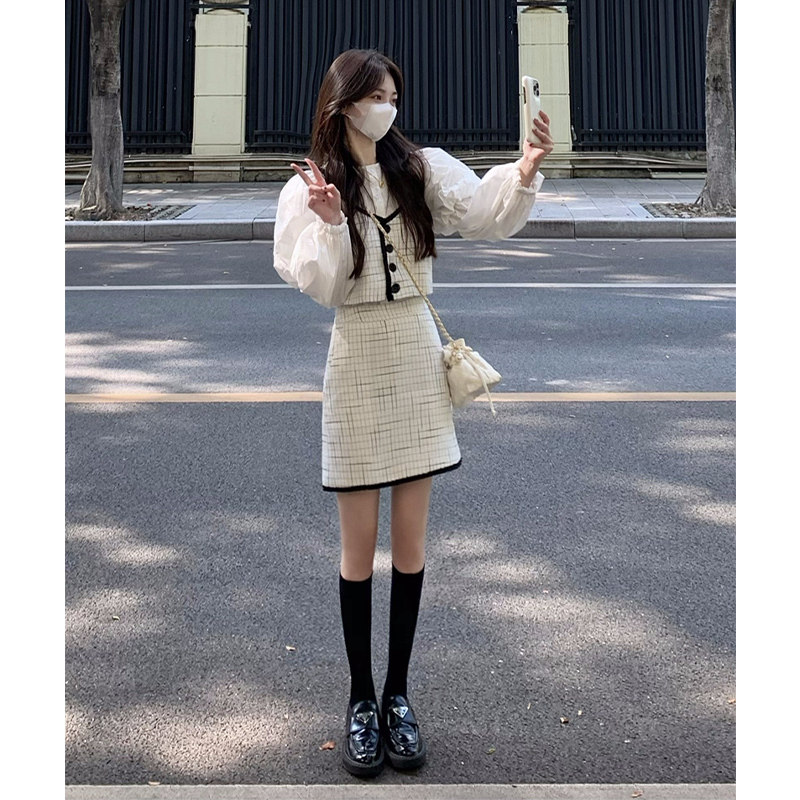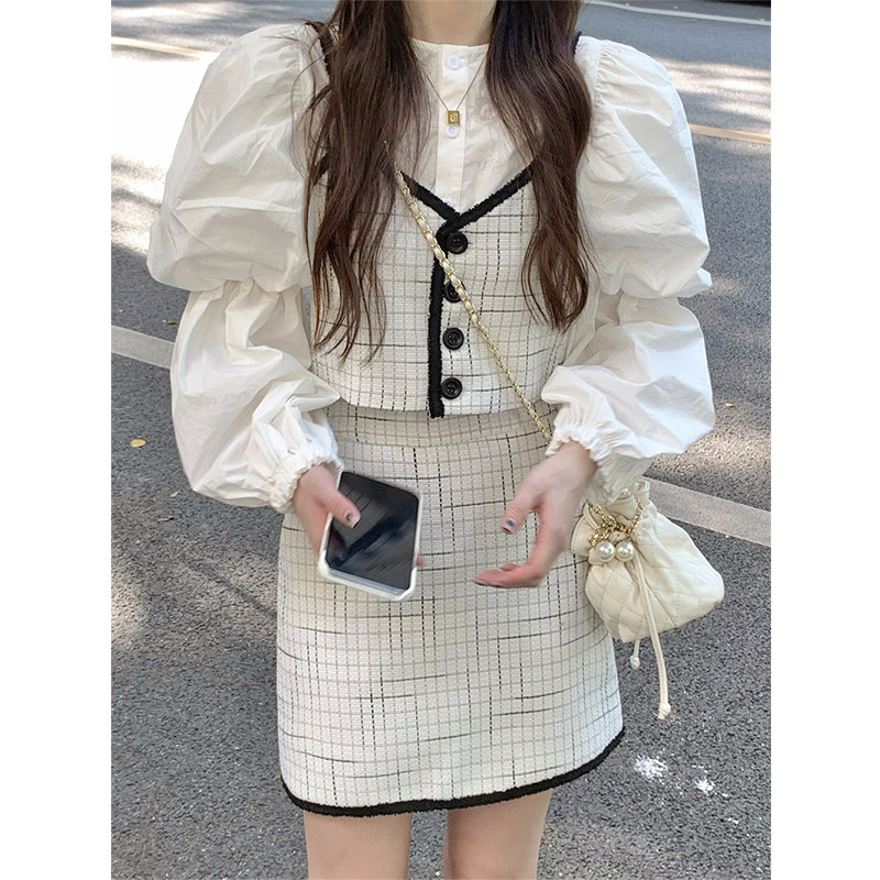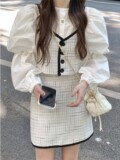 Комплект, ретро модная рубашка, приталенная юбка, в стиле Шанель, коллекция 2023, рукава фонарики, высокая талия
