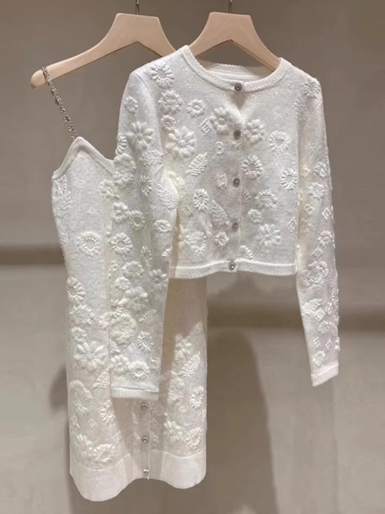 Ретро комплект, трехмерный трикотажный свитер, платье, в стиле Шанель, осенний, изысканный стиль, с вышивкой, в цветочек