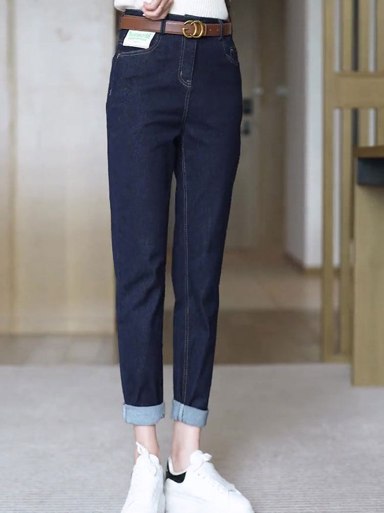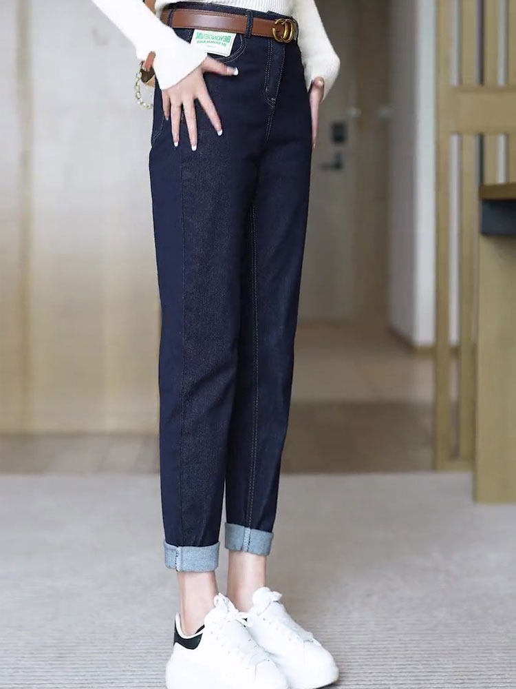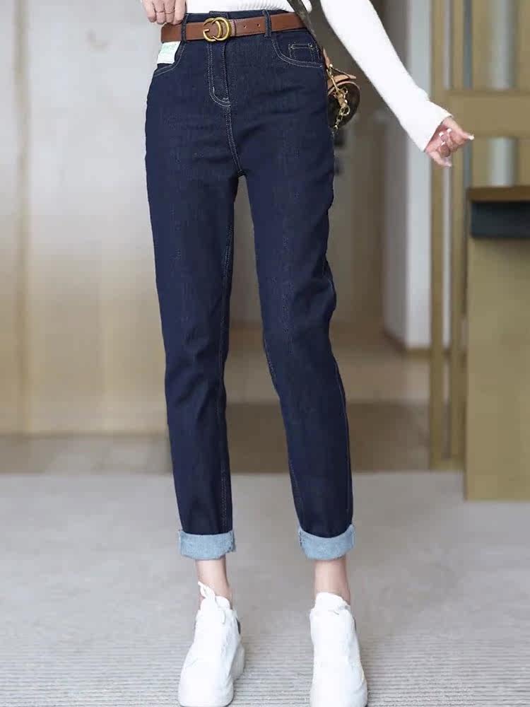 初乙 Штаны, зимние темно-синие приталенные джинсы, высокая талия, свободный прямой крой