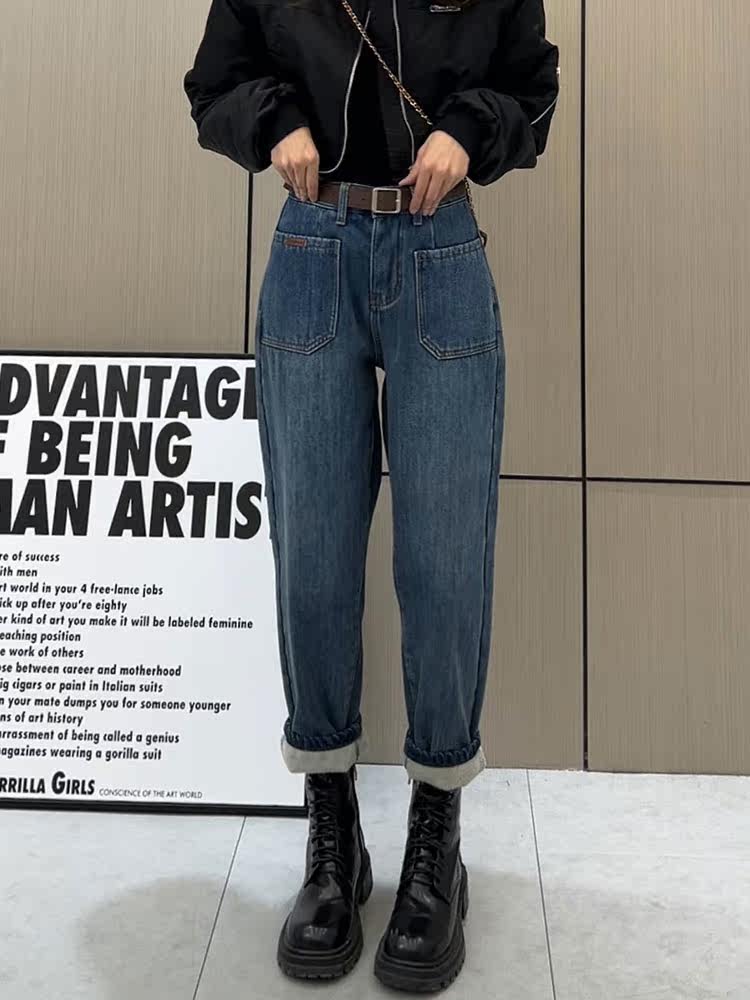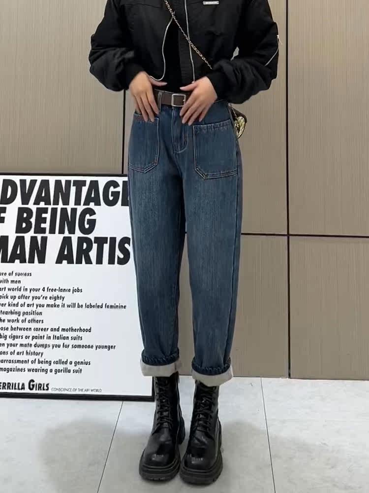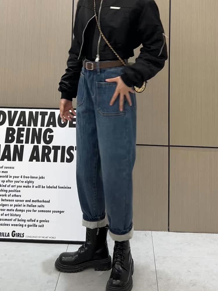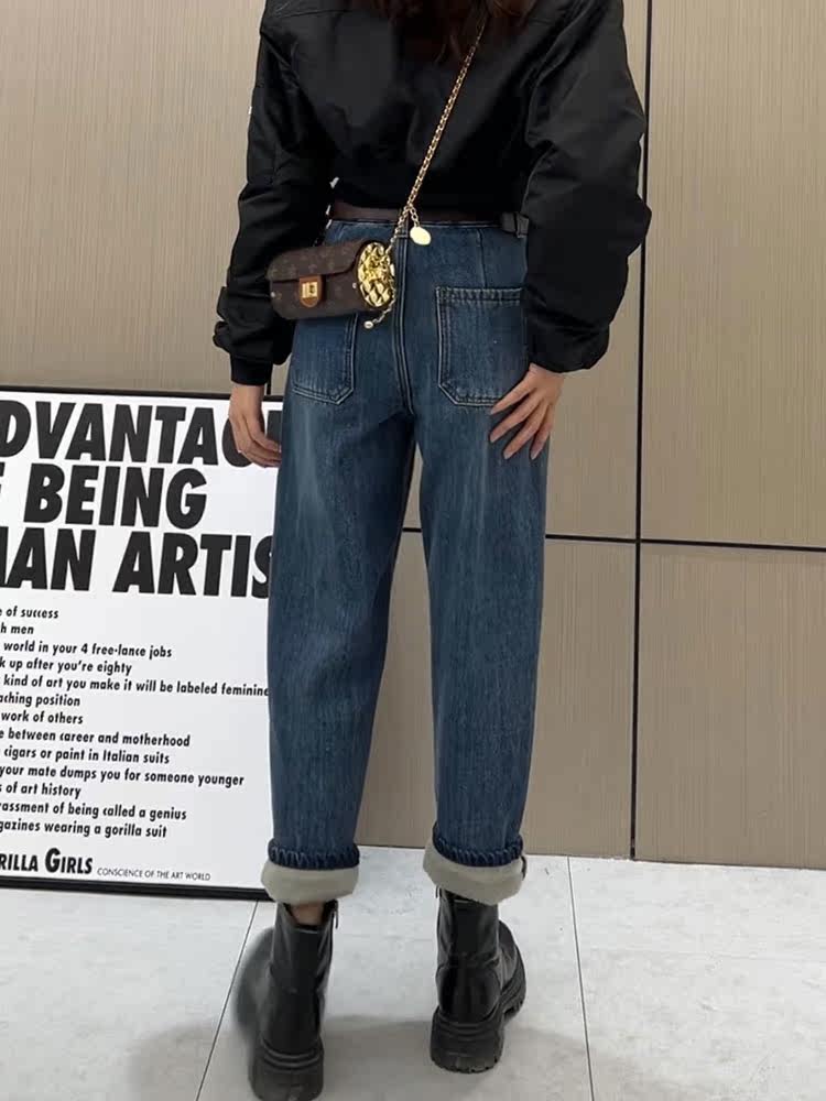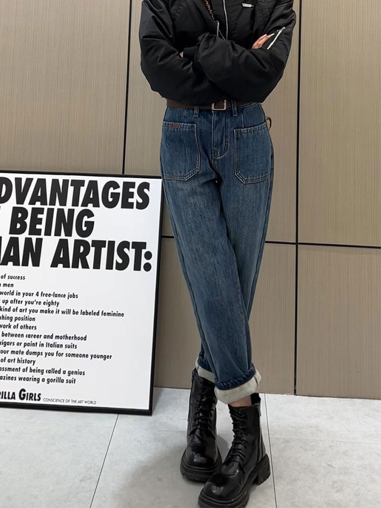 Штаны, флисовые приталенные джинсы с начесом, увеличенная толщина, коллекция 2022, высокая талия, свободный крой