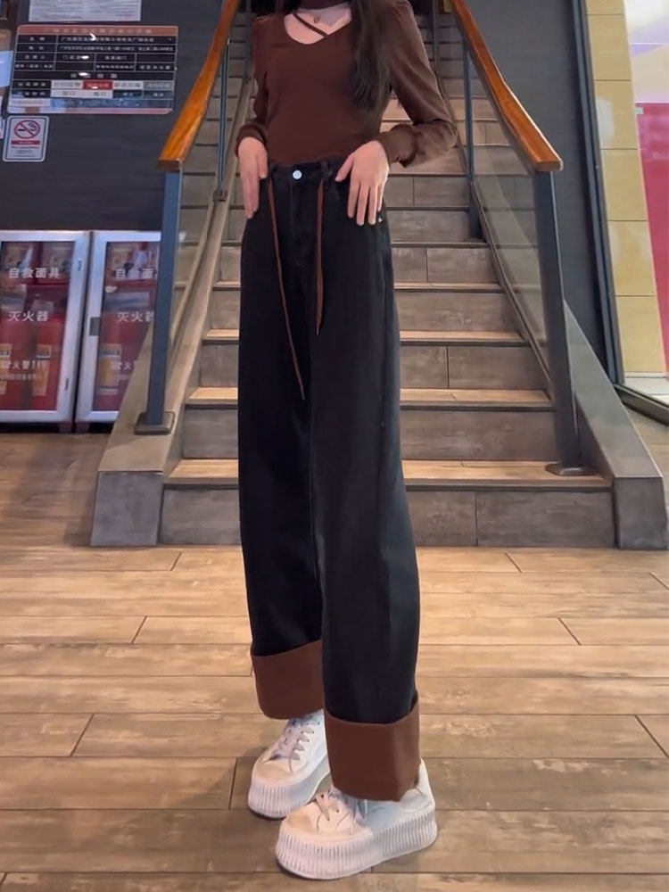 Прямые свободные джинсы, осенние штаны, свободный крой, на шнурках, высокая талия