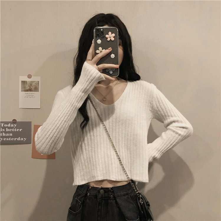 Демисезонный лонгслив, сексуальный короткий трикотажный свитер, V-образный вырез
