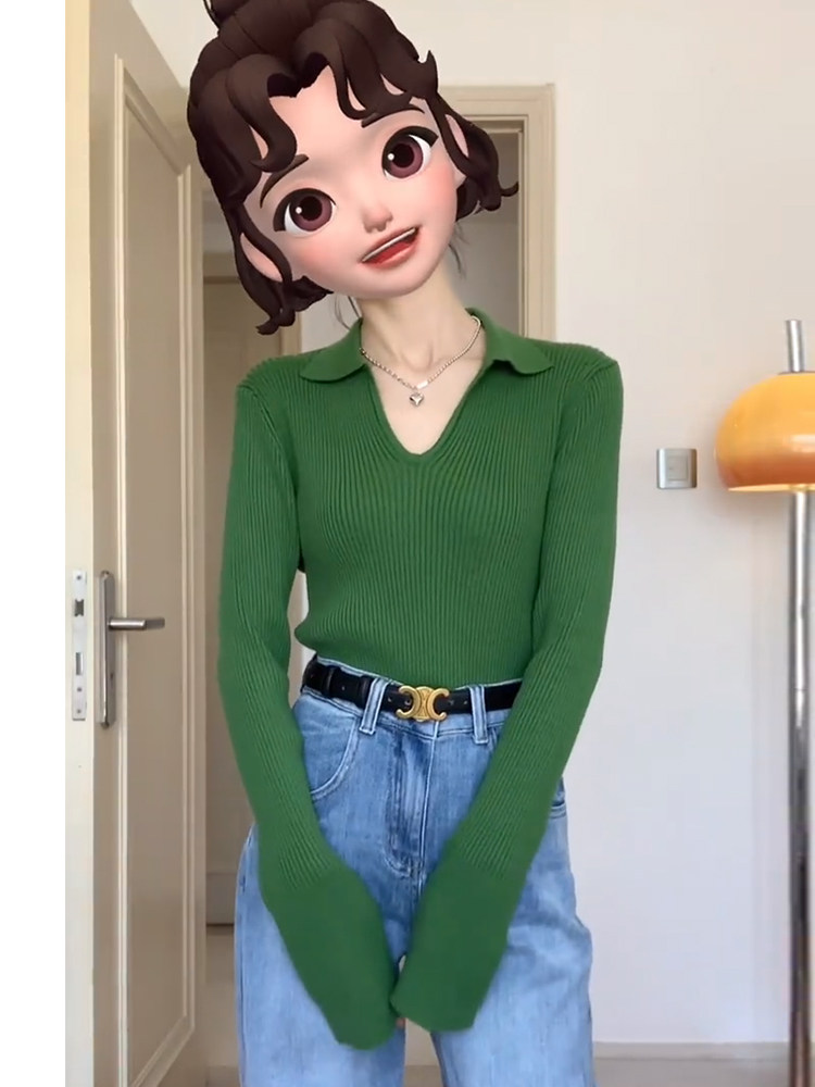 Передний плечо зеленый V-образный выстрел вязаная базовая рубашка для женщин осенью и зимняя дизайн ниша.