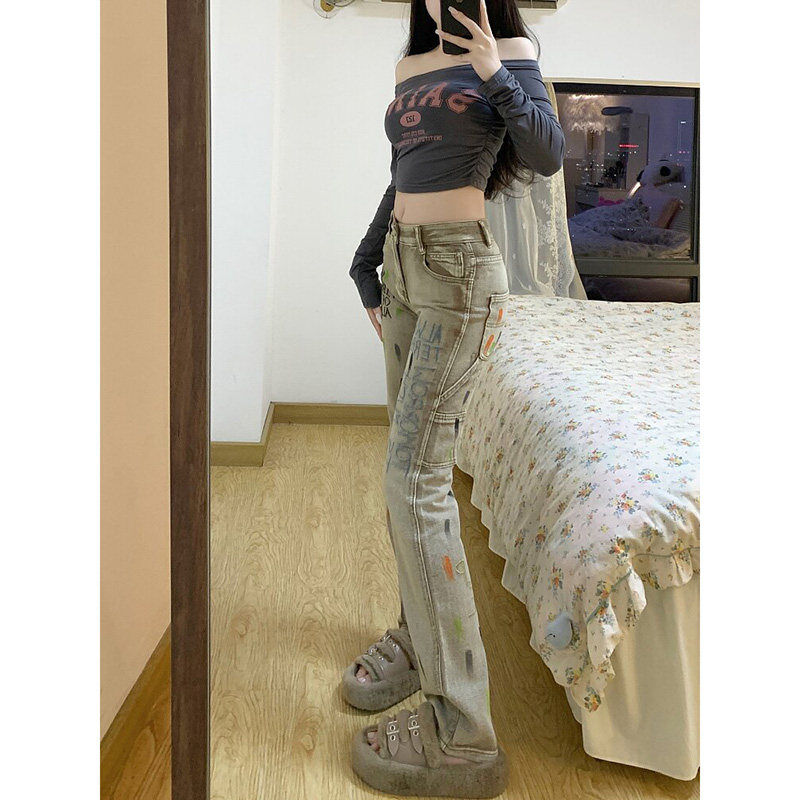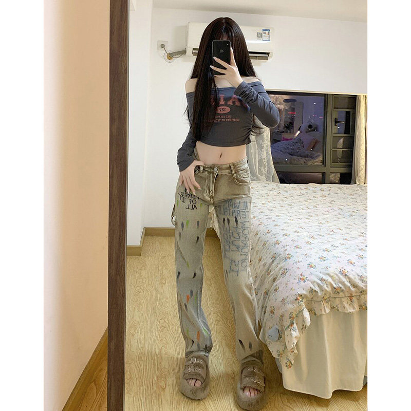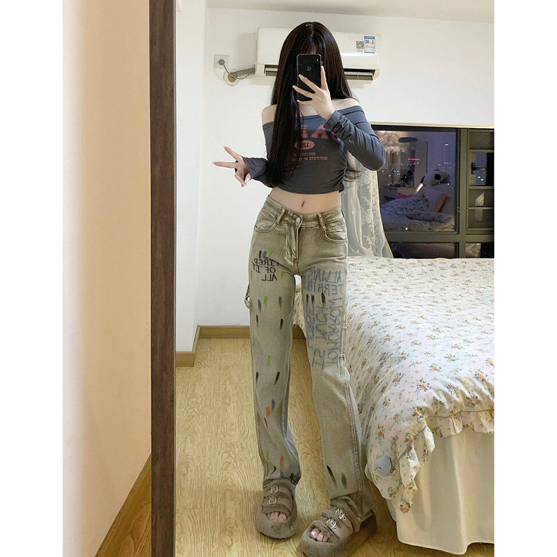 Tide, осенние джинсы, штаны, в американском стиле, с вышивкой, высокая талия, свободный прямой крой