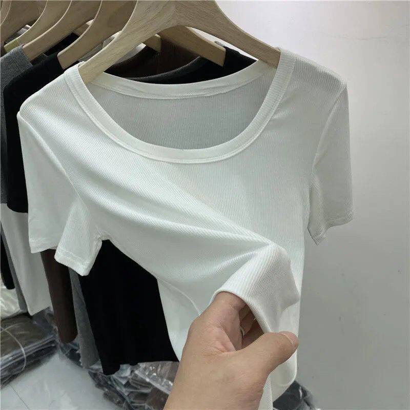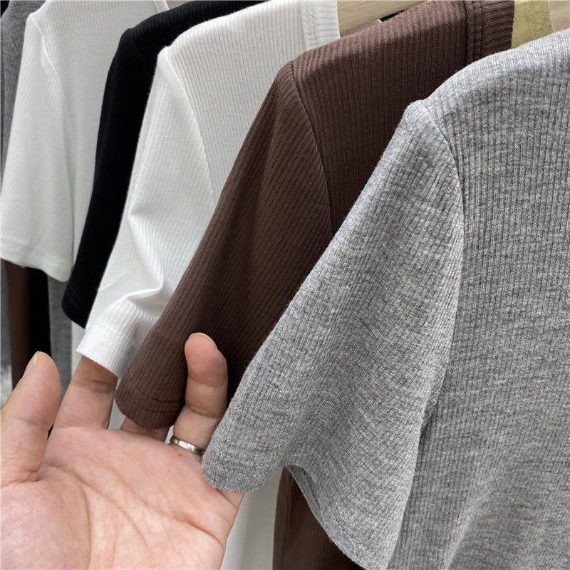 Большой -размером с ледяной нитью в рукаве короткая рубашка T самка 2023 Лето Новая низкая круглая шея -колларная внутренняя рубашка.