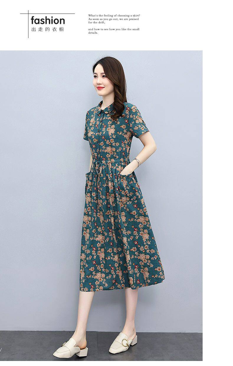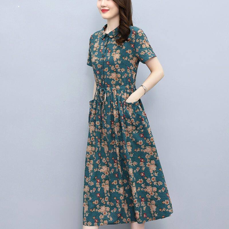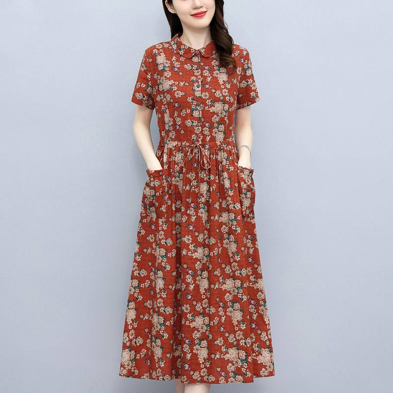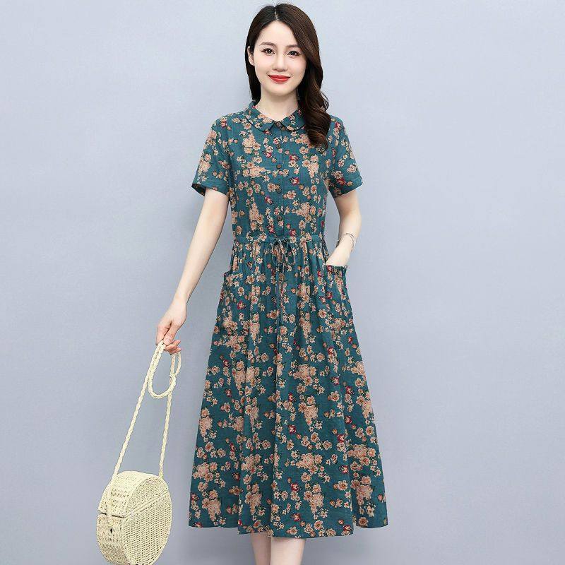 Летнее платье, приталенный корсет для отдыха для матери, юбка, из хлопка и льна, короткий рукав, оверсайз, в цветочек