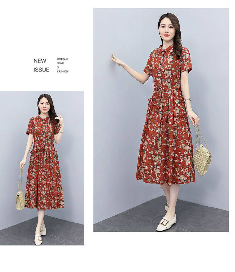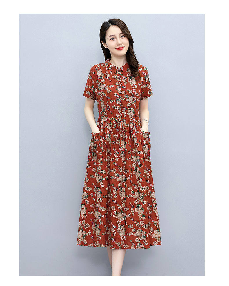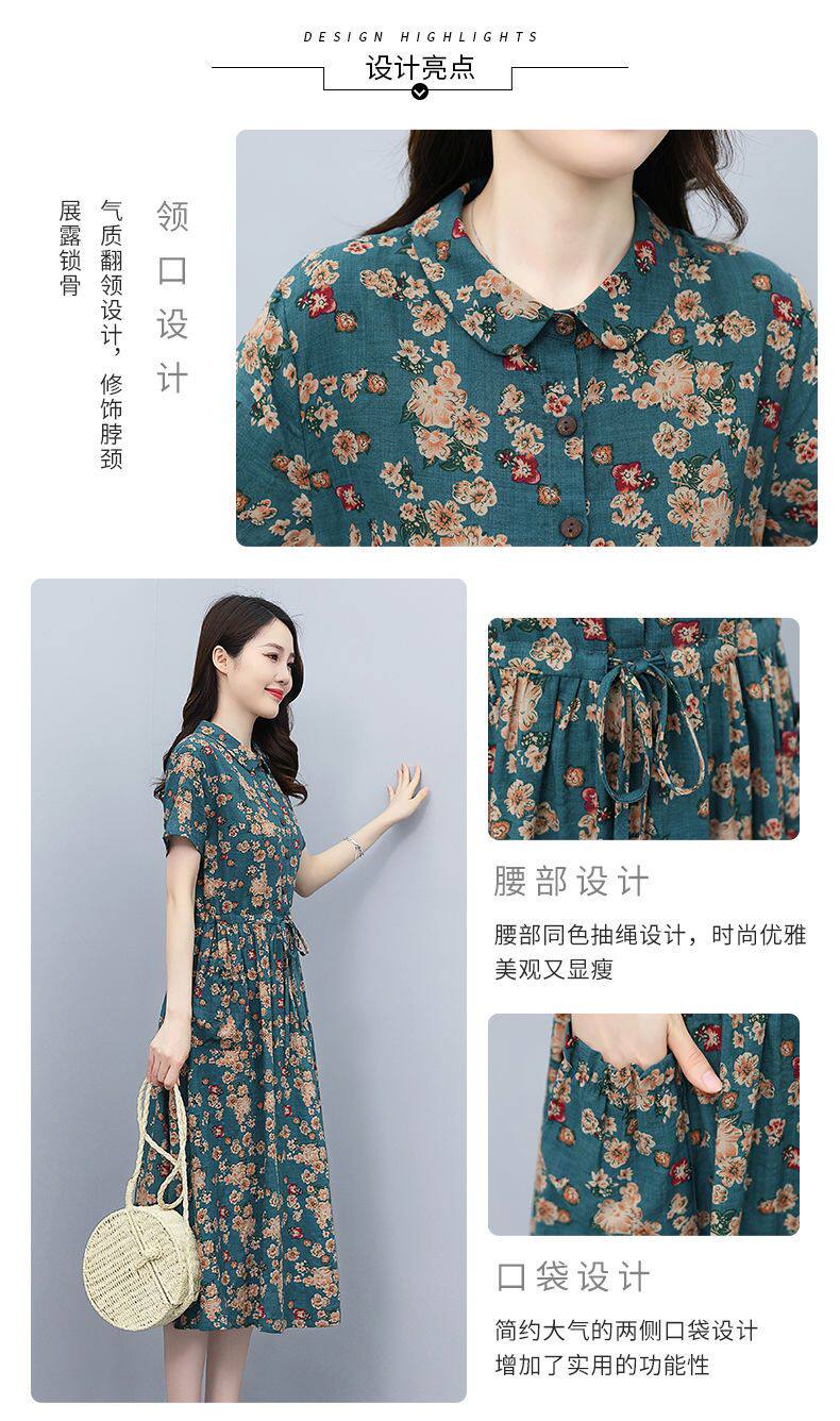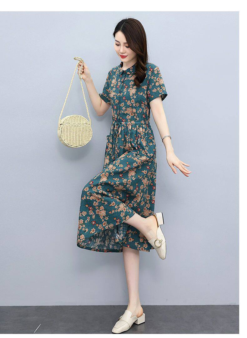 Летнее платье, приталенный корсет для отдыха для матери, юбка, из хлопка и льна, короткий рукав, оверсайз, в цветочек