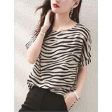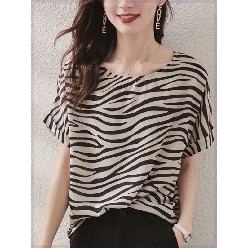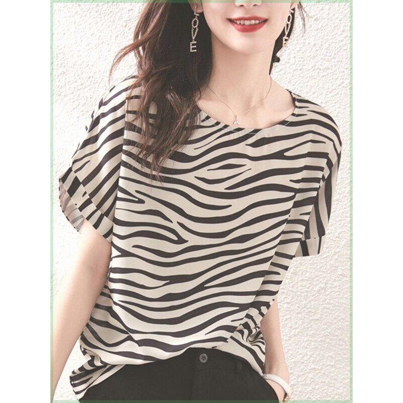 Летняя шифоновая зебра, короткий рукав, свободный крой, большой размер, в западном стиле