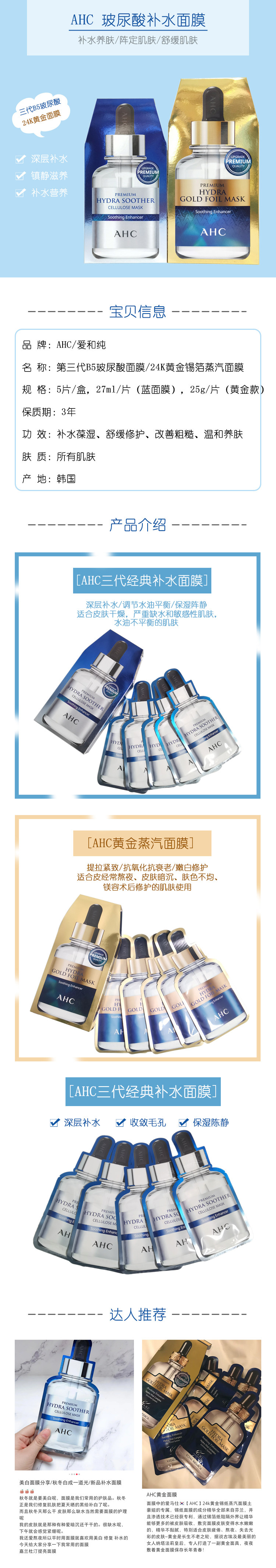 Золотая восстанавливающая увлажняющая питательная маска для лица с гиалуроновой кислотой, Южная Корея