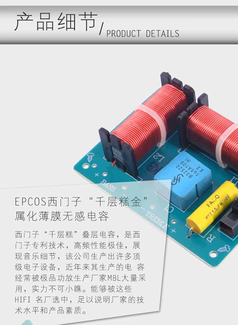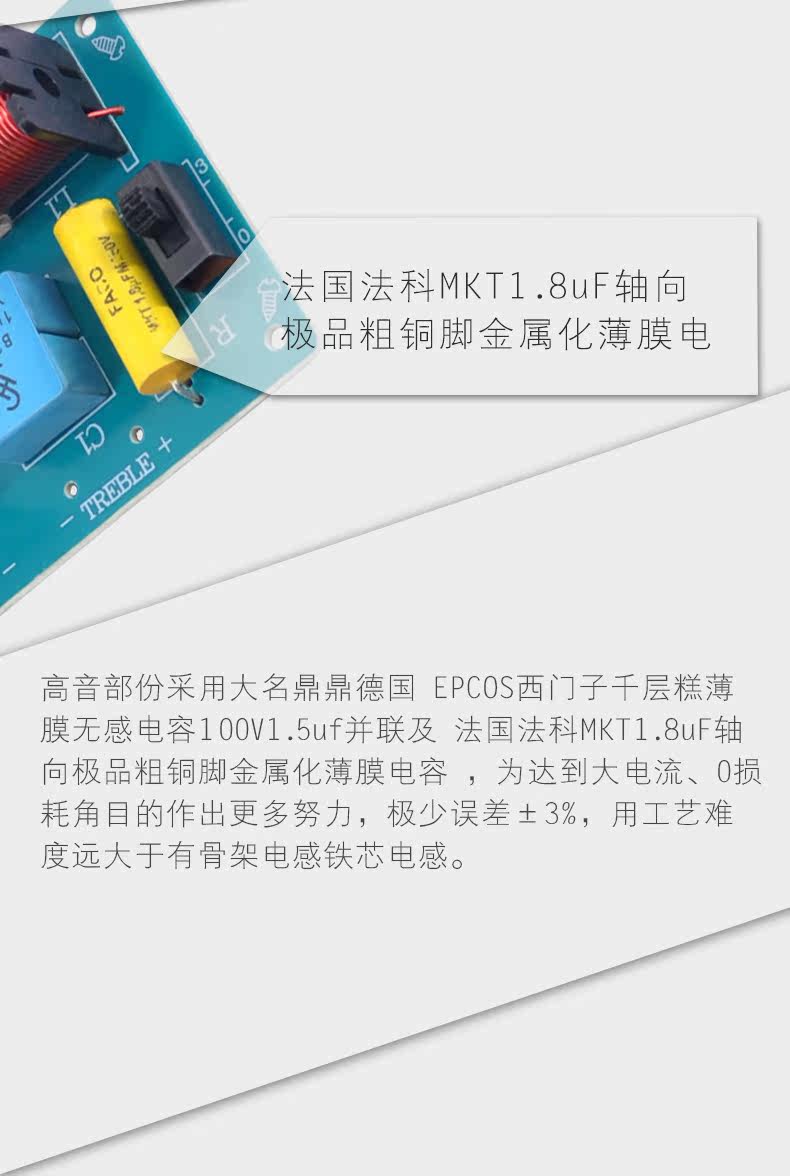 прекрасное мастерство и очень сложные материалы, в частоте используется знаменитый немецкий Epcos Siemens Qianlian Polyclasa, сенсорный конденсатор 100V1.5AF параллель Французская французская Франция Mkt1.8uf Осевая биртированная медная пленка металлические пленки пленки Чтобы добиться большего усилия по достижению цели больших текущих и 0 потерь, ошибок мало&Plusmn; 3%, сложность использования процесса намного больше, чем у электромотонии скелета.Чтобы достичь быстрого прохождения источника звука, платное значение и закрытие высоких частот составляют около 3DB, а низкочастотная часть используется для выходного порта через Todonal для достижения четкого и полного эффекта.Разумный дизайн, изысканный внешний вид и улучшение качества звука.