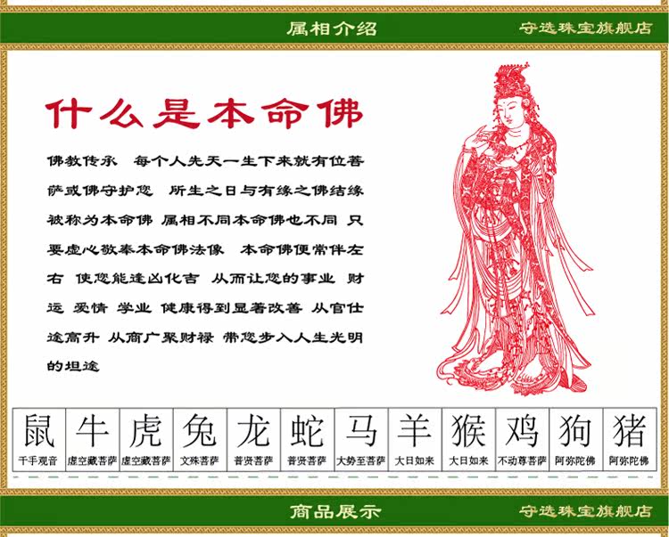 | Размер кольца: | Тысяча рук гуанейн: крыса + веревка, Ksitigarbha Bodhisattva: Ox, Tiger + веревка, Манджушри Бодхисаттва: кролик + веревка, Samantabhadra Bodhisattva: дракон, змея + веревка, Bodhisattva Mahasthamaprapta: лошадь + веревка, Великое солнце Татхагата: овцы, обезьяна + веревка, Бодхисаттва бессмертия: курица + веревка, Амитабха: собака, свинья + веревка |