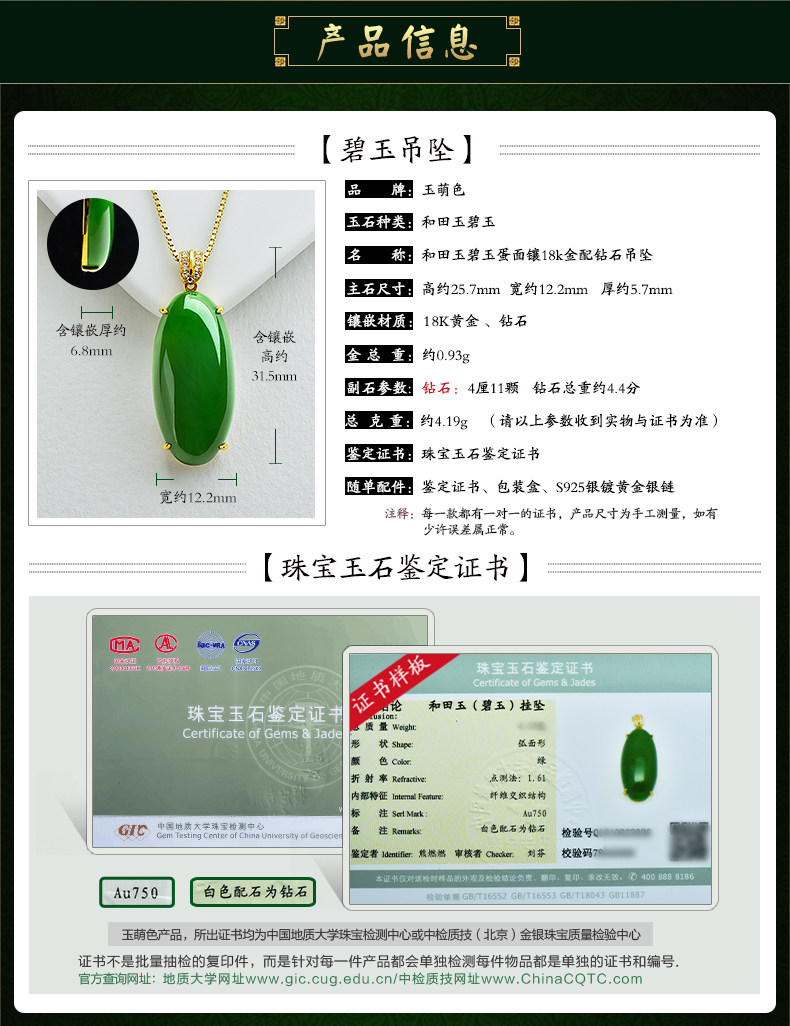 玉萌色 Яшма, золотая подвеска из нефрита, 18 карат