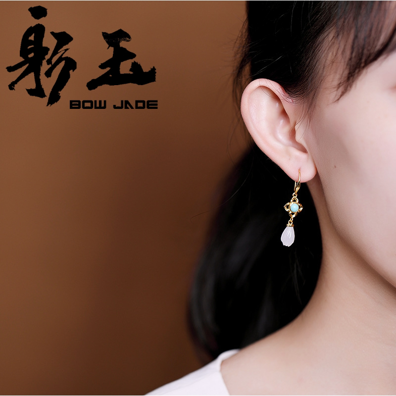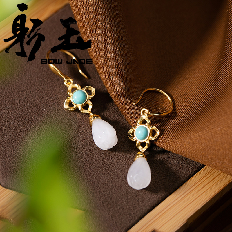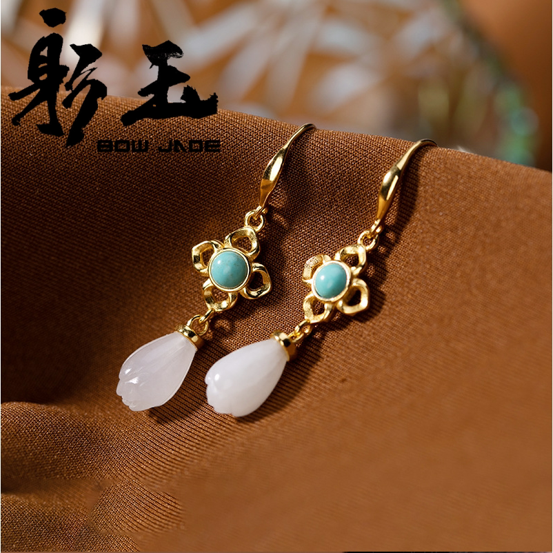 Ретро бирюзовые серьги из белого нефрита, орхидея, серебро 925 пробы