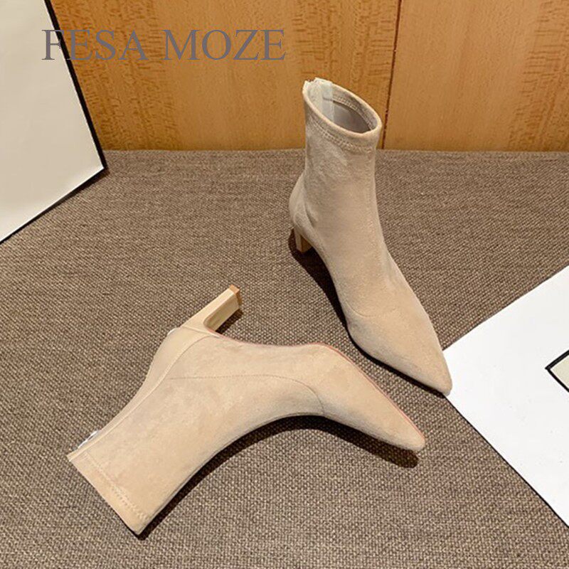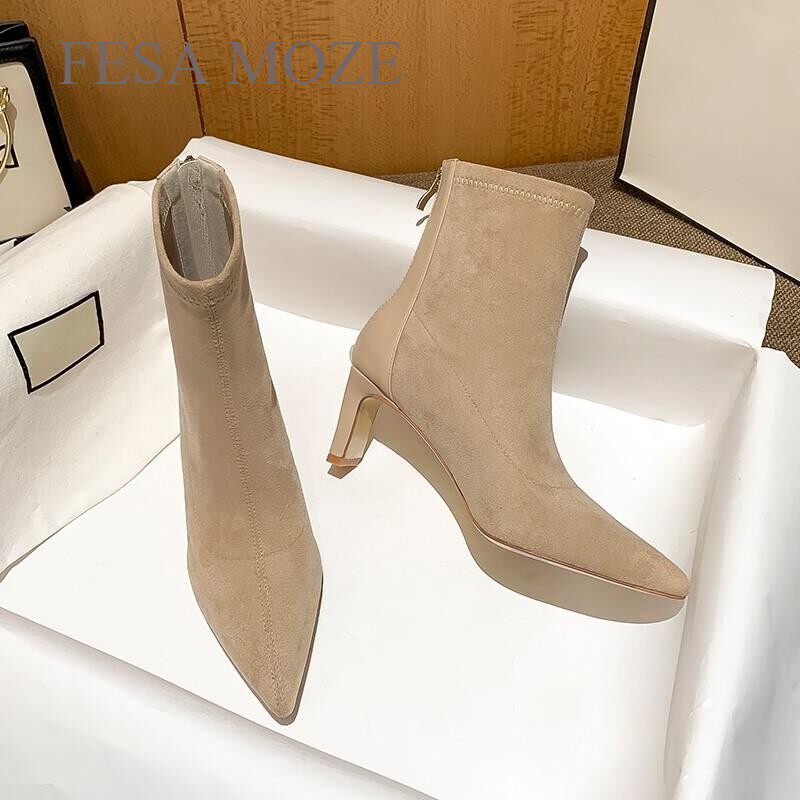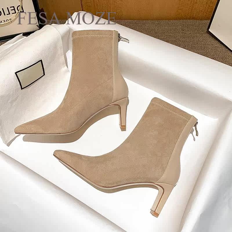 Гонконгская высокая высокая короткая женская синглы Sue Sue2023 Осень и зима Новая эластичность Тонкая и тонкая кожаная бархатная поверхность XUE