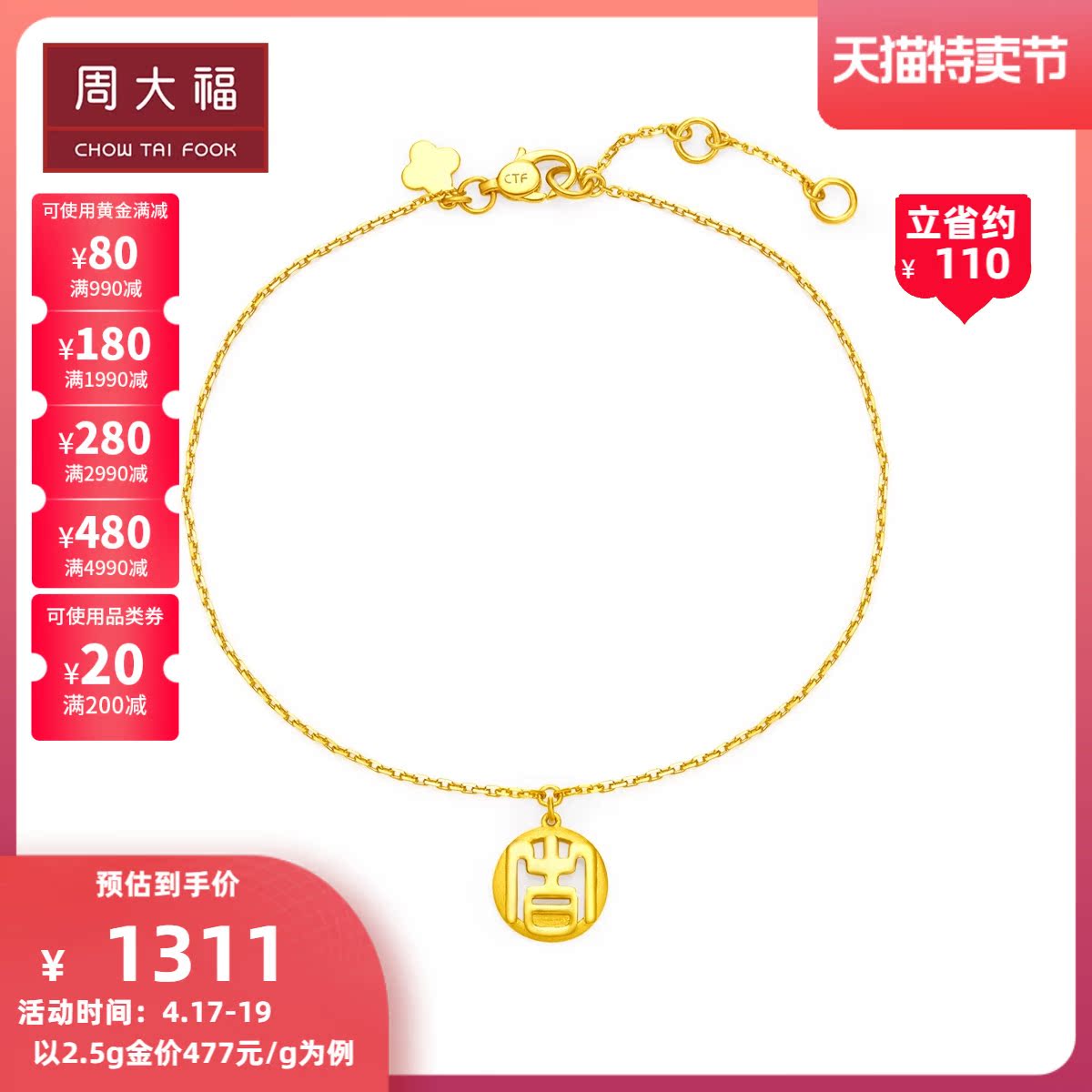 周大福 Ювелирные украшения guochao ji -maracter tag золотой браслет женский цент