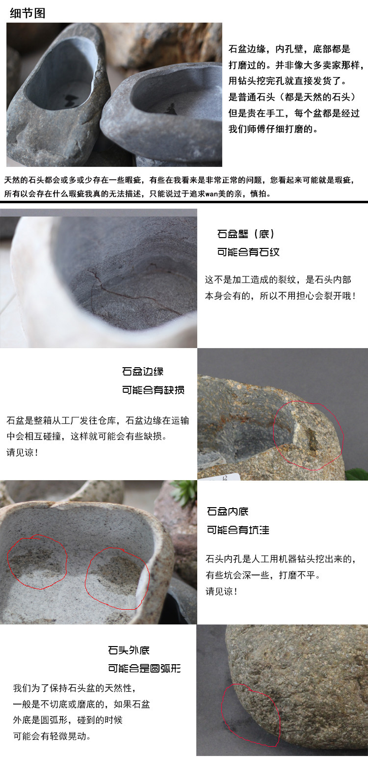 В процессе изготовления каменных цветочных горшков мастер попытается сохранить оригинальную и грубую сторону камня, поэтому при открытии отверстия он будет тщательно обработан с общей ситуацией камня, чтобы минимизировать слишком много ручной модификации, поэтому что натуральный камень еще более хорошо слияние цветочных горшков