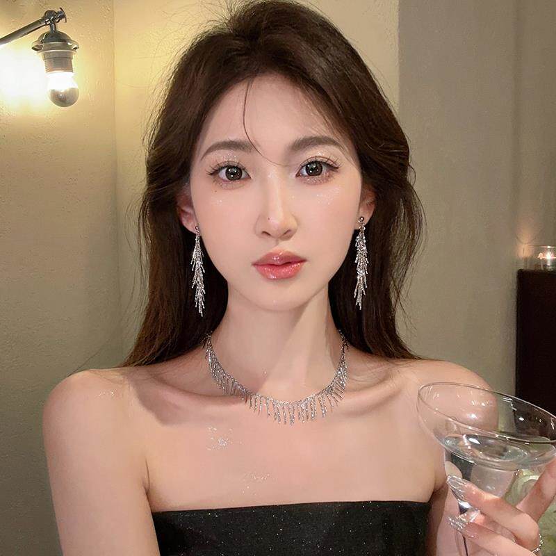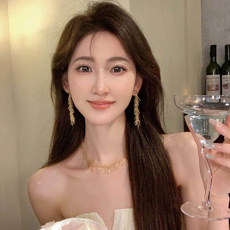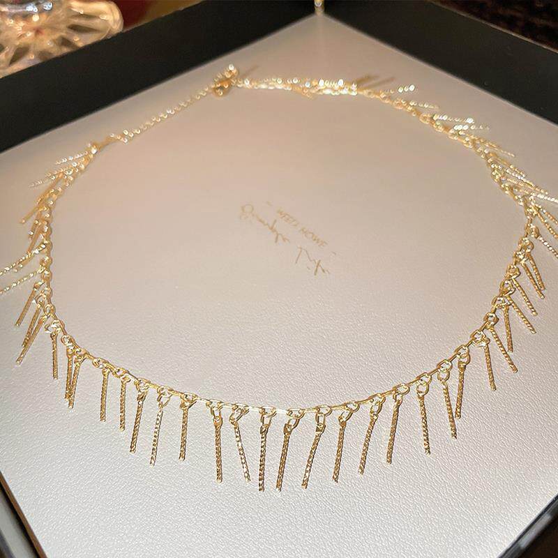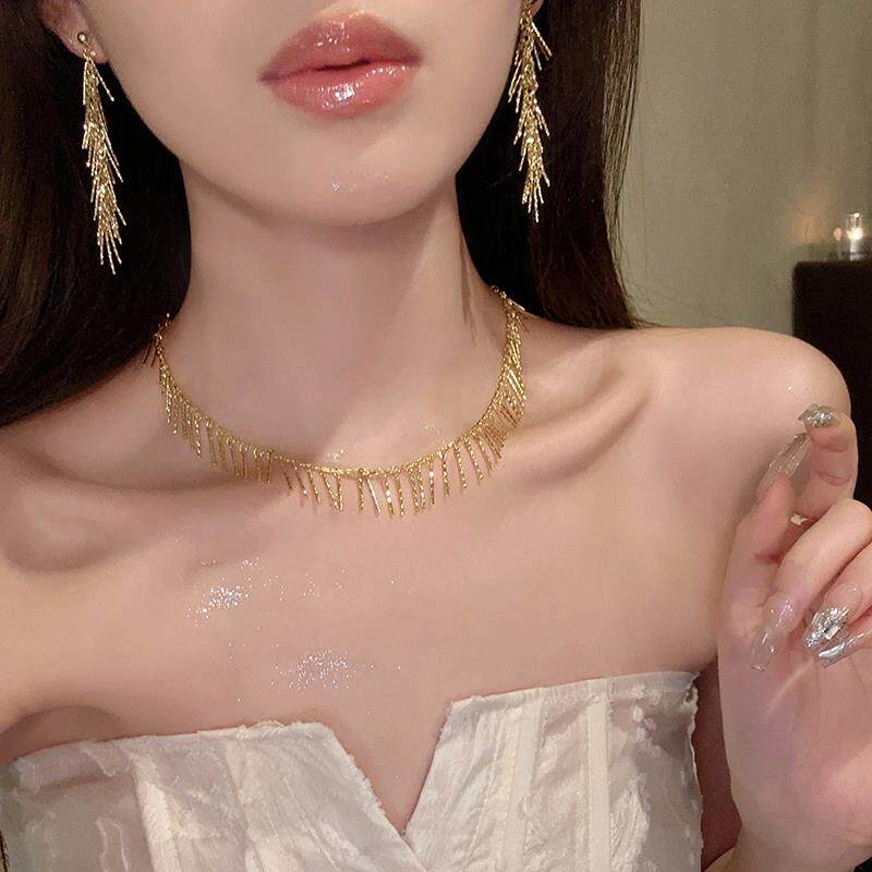Модное небольшое дизайнерское ожерелье с кисточками, изысканная цепочка до ключиц, легкий роскошный стиль, тренд сезона, изысканный стиль, яркий броский стиль