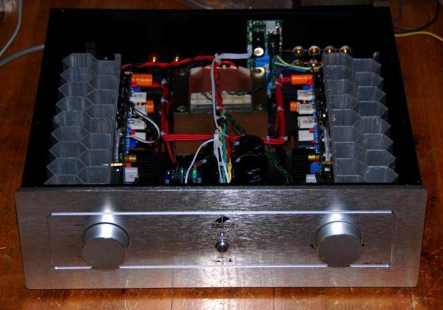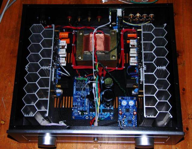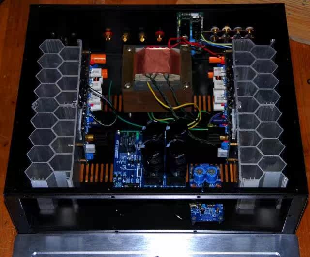 Шасси железное, качество изготовления хорошее. Радиатор на фото выполнен из сотового алюминия, а на следующем будет заменен на обычный радиатор. Трансформер на фото – квадратная корова. Если хочется большей мощности и лучшего соотношения сигнал/шум, можно заменить на кольцевую корову + железную крышку. Первичная и вторичная части кольцевой коровы экранированы медной фольгой. Однако в этом случае изготовление будет более хлопотным, потребует дополнительных затрат, да и сроки изготовления также займут несколько дней. Вы можете связаться заранее.