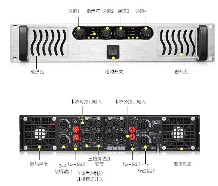Якили Профессиональный четырехканальный высокий уровень высокой мощности с задним усилителем мощности
