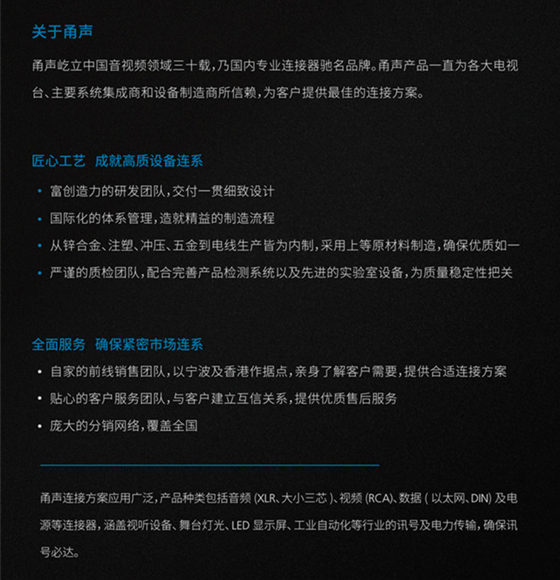 * Новый динамик подключает всю сеть!Стоя в тридцатилетнем и известных профессиональных коннекторах в Китае, искренне представляют новые спикеры для аудио и видеоиндустрии— прошелМеждународная сертификация UL и CSAАналогичные продукты в стране в основном не являются аутентификацией, обеспечивая высокое качество сигнала, передаваемого сигналом.