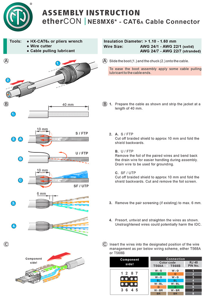 - Следуйте указанному CAT6A, компонентам соответствуют ISO/ IEC 11801 и TIA/ EIA 568-C.2