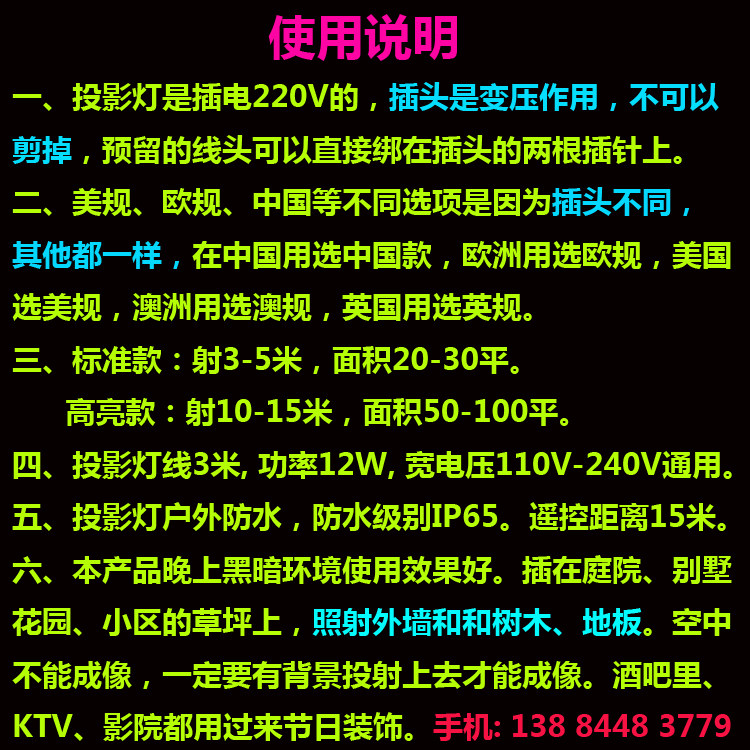 Высоко-яркая модель: может стрелять около 5-15 метров, около 50-100 квадратных метров и водонепроницаемость на открытом воздухе.