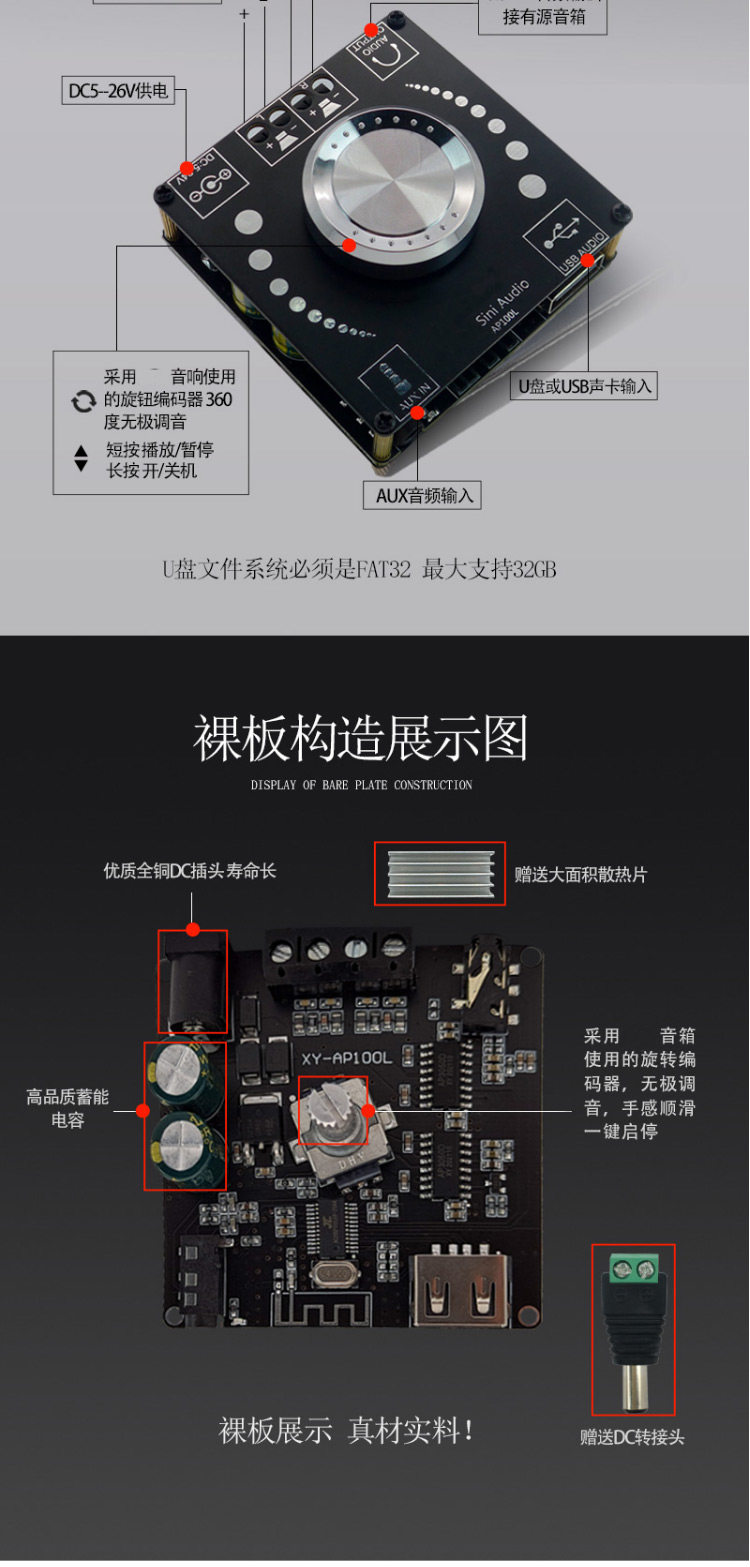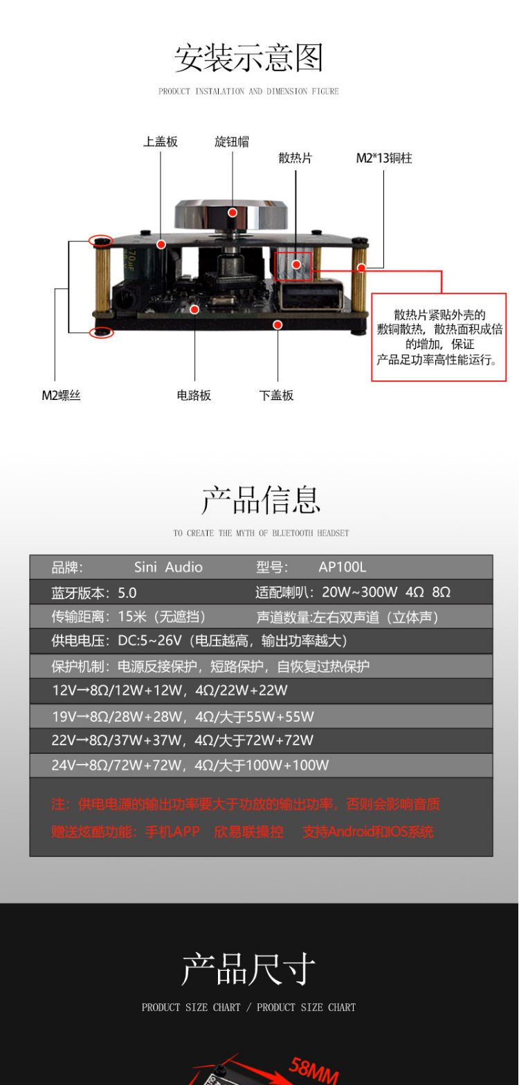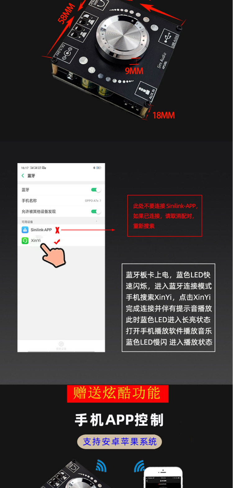 SINI AUDIO 100WX2 Стерео Bluetooth 5.0 Цифровая плата усилителя Двойной канал 360 градусов Неполярная настройка