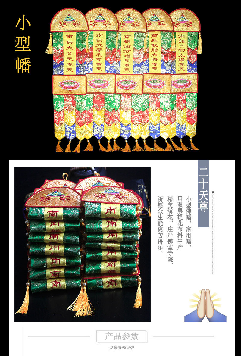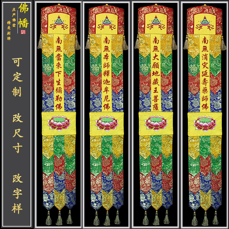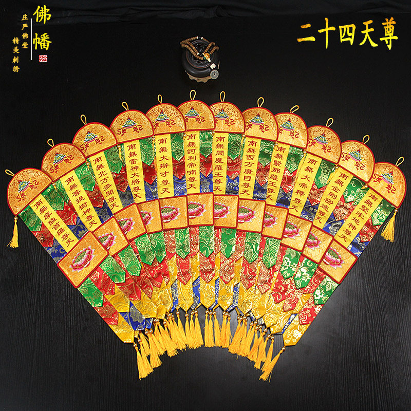 Буддийская вышивка красочное мастерство в бутике, создание маленьких молитвенных флагов, 24 вертикальных вертикальных буддийских храмов, двенадцать генералов, Будда Тан