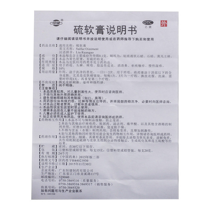 恒健 Серная мазь 10%*20G*1 ветвь/коробка севалезный дерматит.