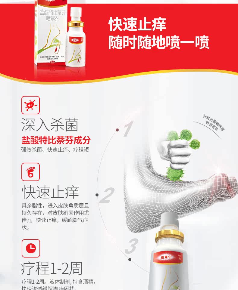 达克宁 Тербинафина гидрохлорид спрей 30 мл для лечения грибковых инфекций, спрей для лечения бери-бери, противозудная мазь для рук, ног и суставов