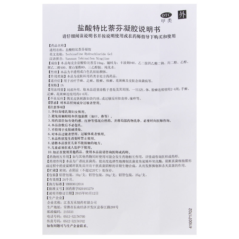 万川医药 Гель гидрохлорной кислоты Тербин Гель 1%*25G*1 Поддержка/коробка из Tinea Tinea, Tinea, Tinea, Tinea Skin Rosary