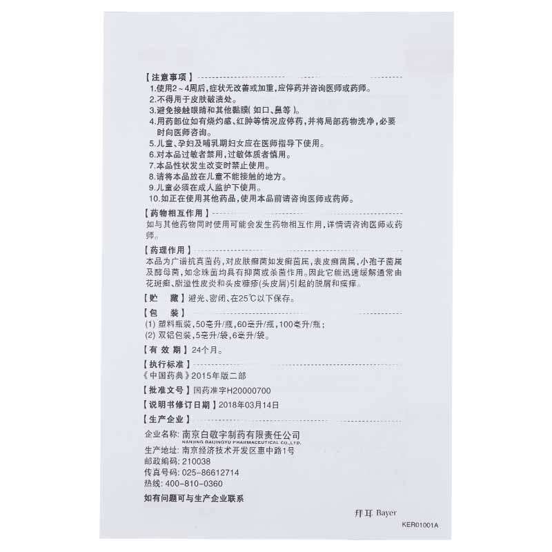 [Использование и дозировка] локальное внешнее использование.Цветок tinea, один раз в день, в течение 5 дней; себорейный дерматит и отруби кожи головы, два раза в неделю в течение 2-4 недель; нанесите соответствующее количество этого продукта на кожу или влажные волосы, протрите через 3-5 минут, промыть водой Полем