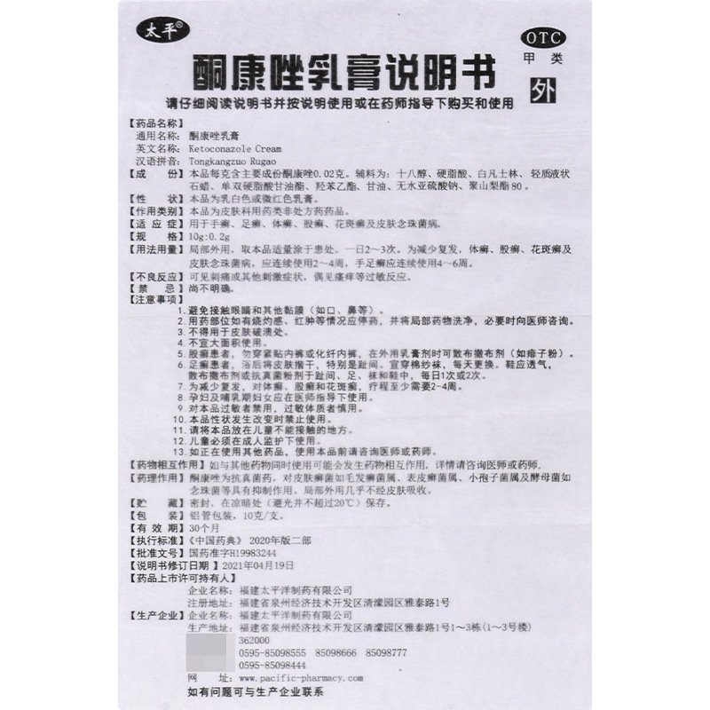太平 Кетоконазол крем-мазь натуральный 10 г при дерматофитии стоп, зуде, кандидозе кожи, зуде кожи для наружного применения