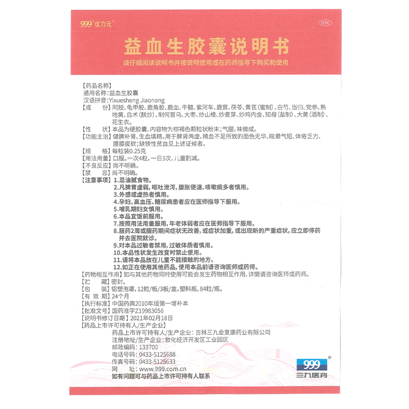999 Youli Yuan Yisheng Capsule Дополнение Qi и кровь, Ejiao Astragalus, головокружение, усталость, женская анемия 0,25 г*84 капсулы