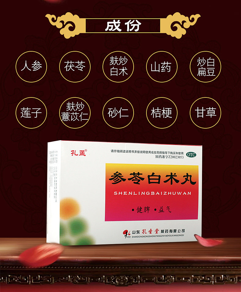 孔孟 Shenling Baishu Pill 6G*10 мешков селезенки, питательница ци, усталость, усталость, меньше стула