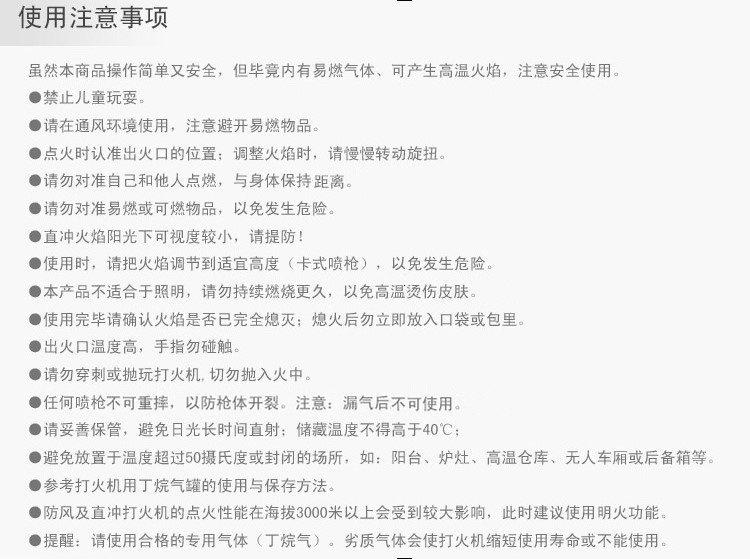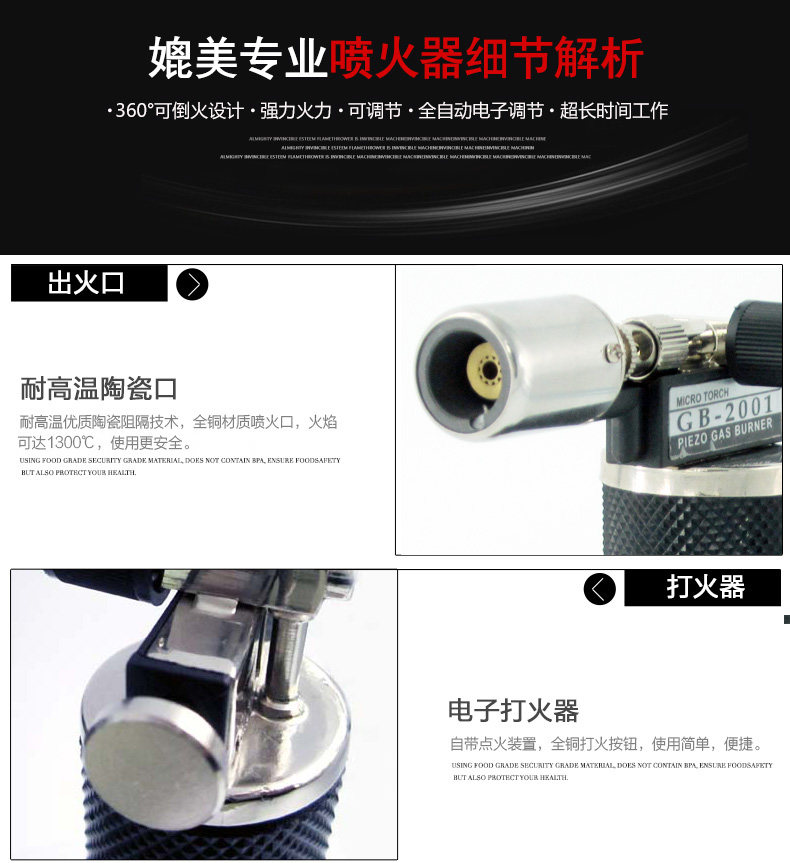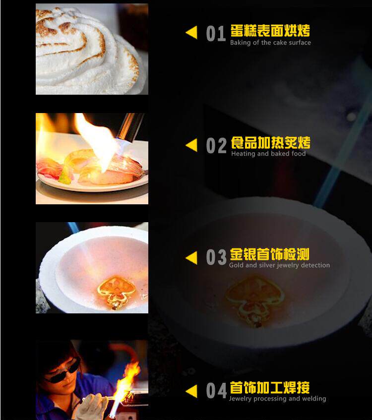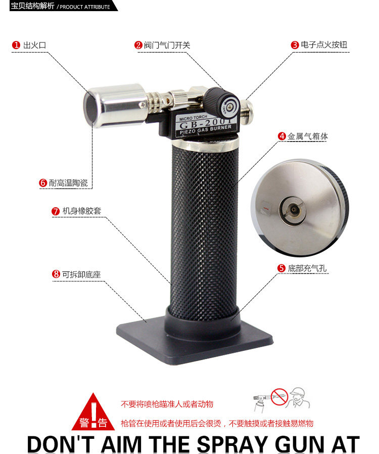Высокая температура, устойчивая керамике+из нержавеющей стали, Noble Sprinkler+металлическая газовая коробка может продолжать распылять огонь и ожоги на газ;Оснащен пряжкой безопасности (его нельзя выпустить в электронике после пряжки, и она сохраняется безопаснее).