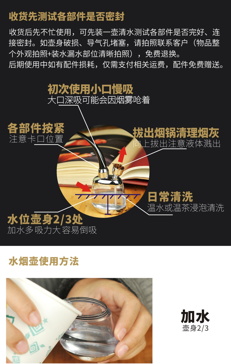КальянполучатьПожалуйстаНе используйте курить в первую очередь,МожетСначала используйте воду, чтобы обнаружить, запечатан ли каждый компонент и не поврежден корпус горшка,УстановитьПосле того, как тест будет правильным, используйте его (если у вас есть проблема с качеством, свяжитесь с обслуживанием клиентов, чтобы подать заявку на бесплатную возврату и замену)Пересечение