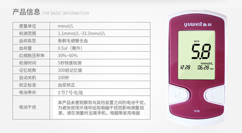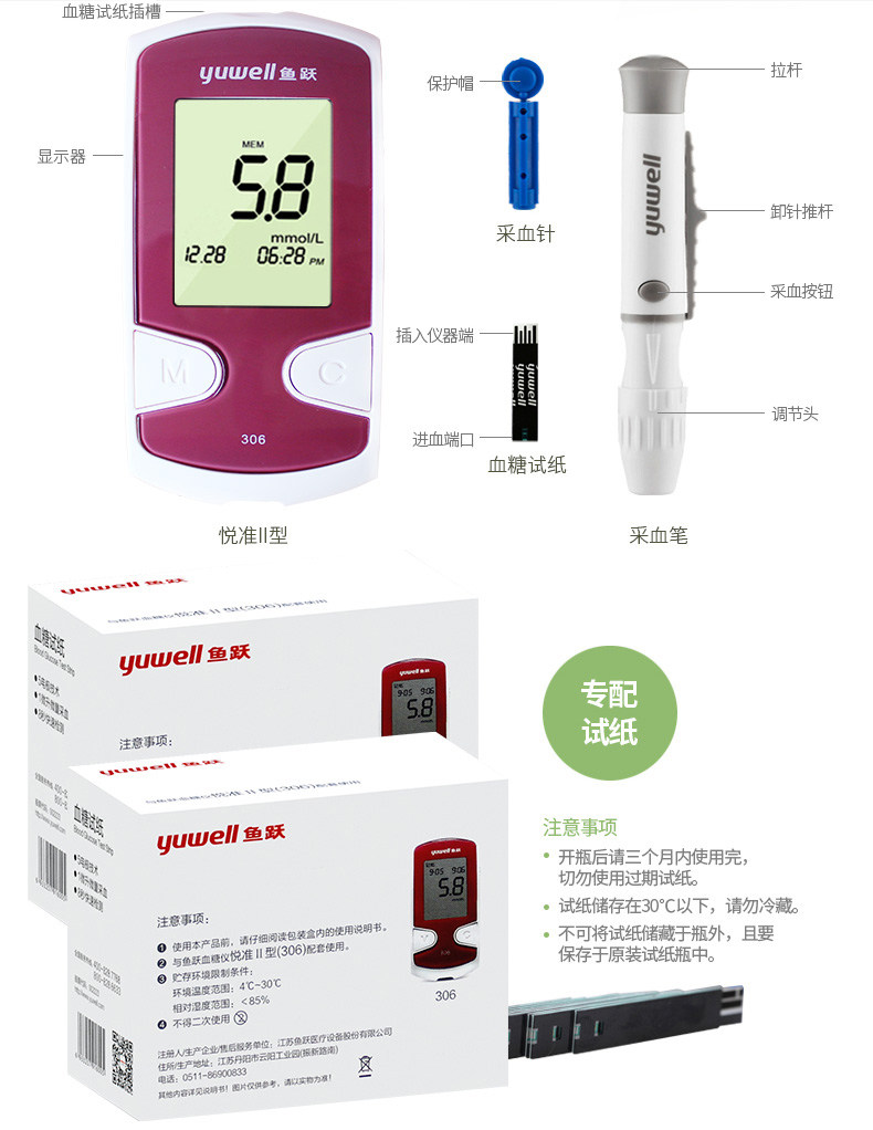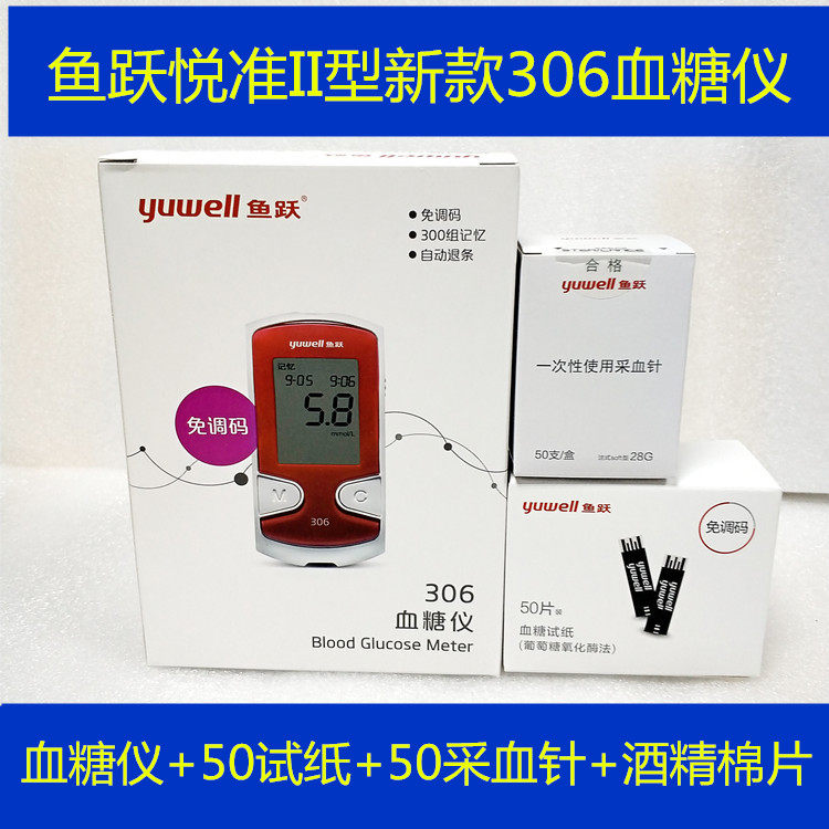 Yuyue Yuezhun Type II 306 Кровяная глюкоза Инструмент Рыба прыгает в крови глюкозу с 50 тестовой полосой глюкозы.