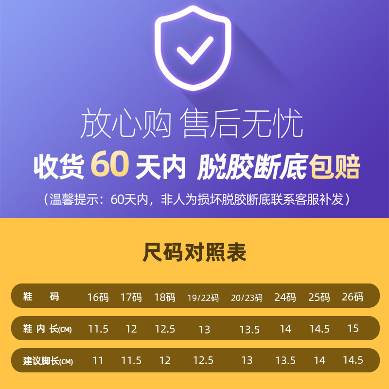 | Размер обуви: | Внутренняя длина 11,5 см, размер 16 подходит на ногу длиной около 11 см., Внутренняя длина 12 см, размер 17 подходит на ногу длиной около 11,5 см., Внутренняя длина 12,5 см, размер 18 подходит на ногу длиной около 12 см., Внутренняя длина 13 см, размер 19/22 подходит на ногу длиной около 12,5 см., Внутренняя длина 13,5 см, размер 20/23 подходит на ногу длиной около 13 см., Внутренняя длина 14 см, размер 24 подходит на ногу длиной около 13,5 см., Внутренняя длина 14,5 см, размер 25 подходит на ногу длиной около 14 см., Внутренняя длина 15 см, размер 26 подходит на ногу длиной около 14,5 см. |