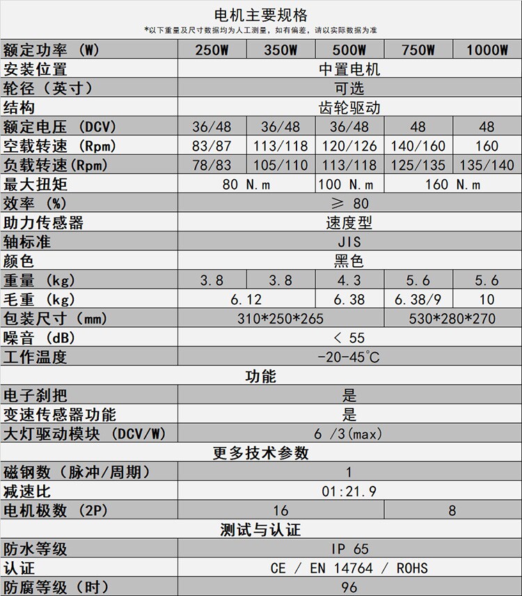 750W-1000W Мотор:Этот средний монтаж легко установить и подходит для велосипедов с Wutong 68/120 мм. Он имеет номинальную мощность 1000 Вт, мощность скорости, коэффициент снижения 1: 21,9 и максимальный крутящий момент 160N.M. Это может обеспечить супер мощную взрывную силу для автомобиля.Супер мощные и эффективные функции значительно увеличивают удовольствие от езды на велосипеде и полностью удовлетворяют сложные потребности энтузиастов езды на велосипеде. Это подходит для горных велосипедов, транспортных транспортных средств и квадроциклов.Цвет этого двигателя черный.