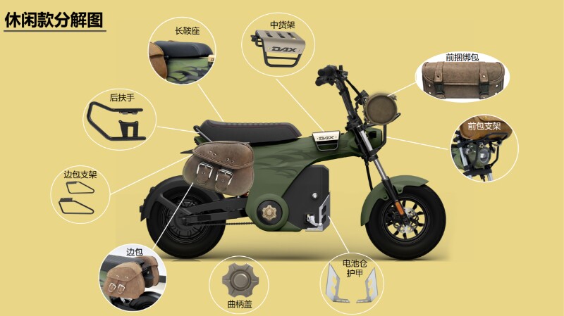 Honda dax.e модифицированные оригинальные аксессуары: седло, боковая сумка, передняя сумка, центральная полка, задний подлокотник, зеркало заднего вида