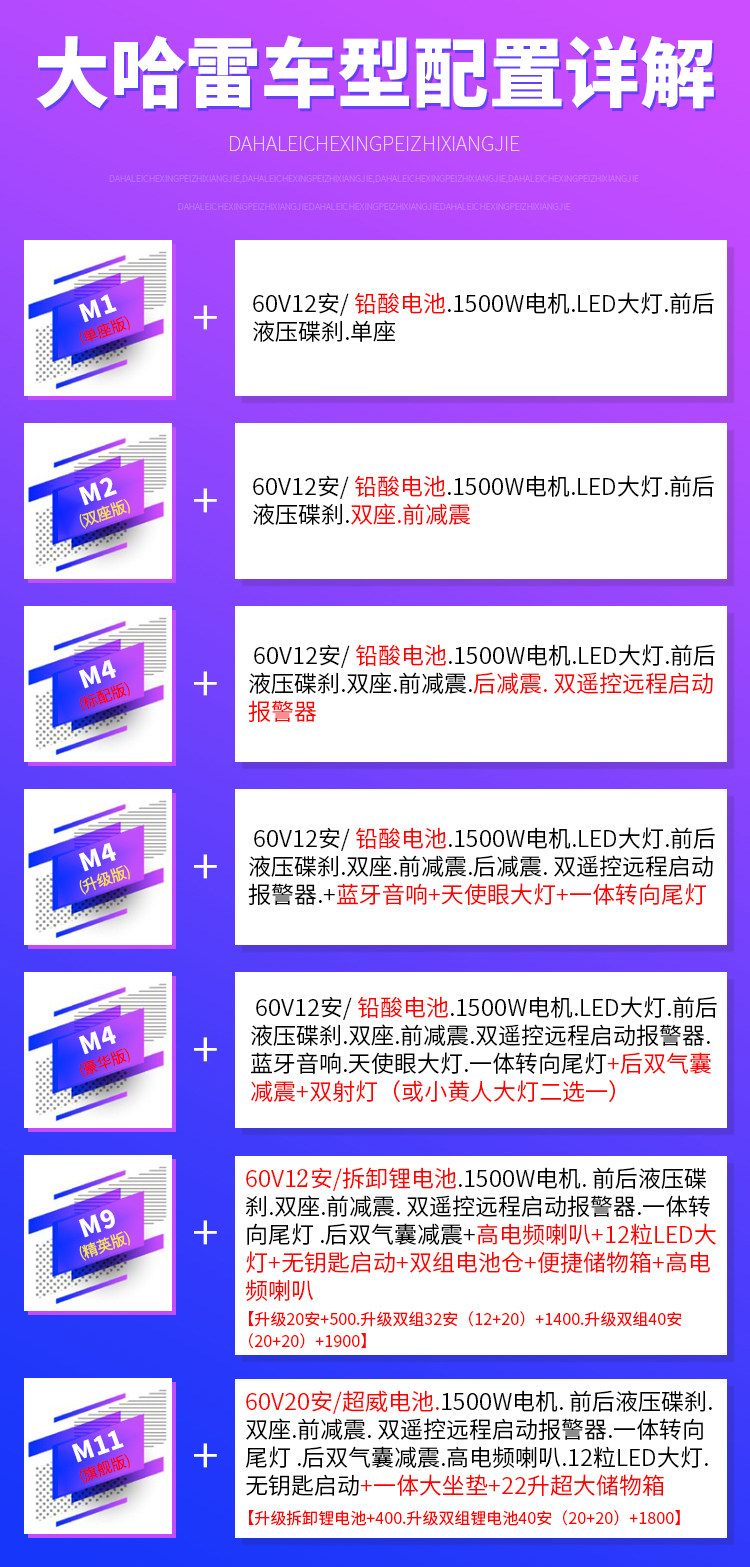 | Цвет: | Родитель -Кильд маленький Харли, Харли, M1 Single Version, M2 Double -Seater версия, M4 Стандартная версия, M4 обновления версии, M4 Флагманская версия, M9 Elite Edition, M11 Флагманская версия |