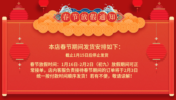 Этот магазин желает вам: с Новым годом!Благополучие! Время праздника весеннего фестиваля в этом магазине:2021.1.31 (19 -й день двенадцатого лунного месяца) до 2021.2.18 (7 -й день первого лунного месяца) Во время праздника получен только заказ, а не отправлен,2021.2.19 (8 -й день первого лунного месяца)Чтобы восстановить работу, заказы во время весеннего фестиваля будут отправлены по очереди в зависимости от времени оплаты. Во время праздника, пожалуйста, попросите своих друзей делать покупки самостоятельно. Не волнуйтесь, мы решим их сразу после работы. |