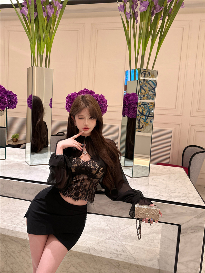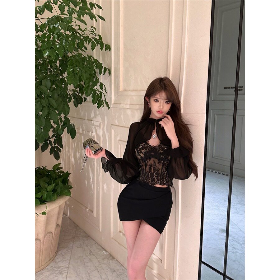 Черный шифоновый лонгслив, зимний кружевной комплект, топ с чашечками